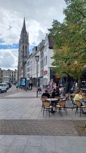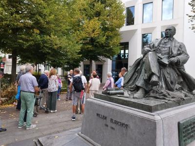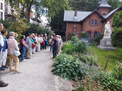 Onze gidstoer met Ivan startte op de Mechelse plein. Het was de bedoeling om eerst de Sint Joriskerk te bezoeken, die normaal om 14 uur zou opengaan. Maar, de kerk bleef gesloten. Dan maar met enkele foto’s uitleg over de kerk gekregen. De verdere wandeling van twee uur door de buurt bracht ons langs stadsdichters, musea, theater en andere geschiedenis van de wijk tot in de botanische tuin, welke vroeger een kruidentuin was. Zeer toepasselijk wachtte ons daar en verrassing en mochten we proeven van de befaamde kruidenlikeur “Elixir d’Anvers”. Langs het Rubens huis en de Meir sloten we af op de groenplaats bij het standbeeld van Rubens.