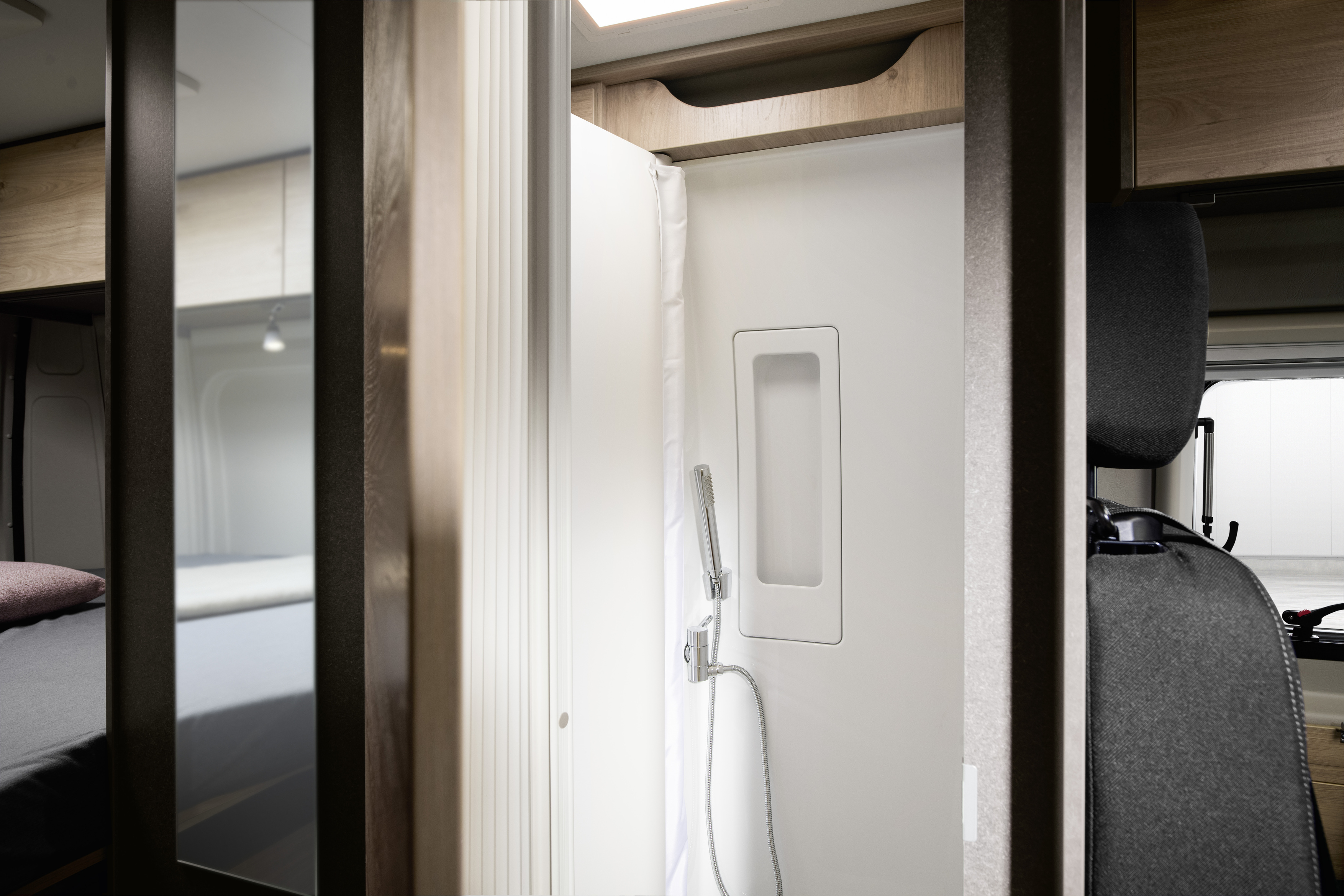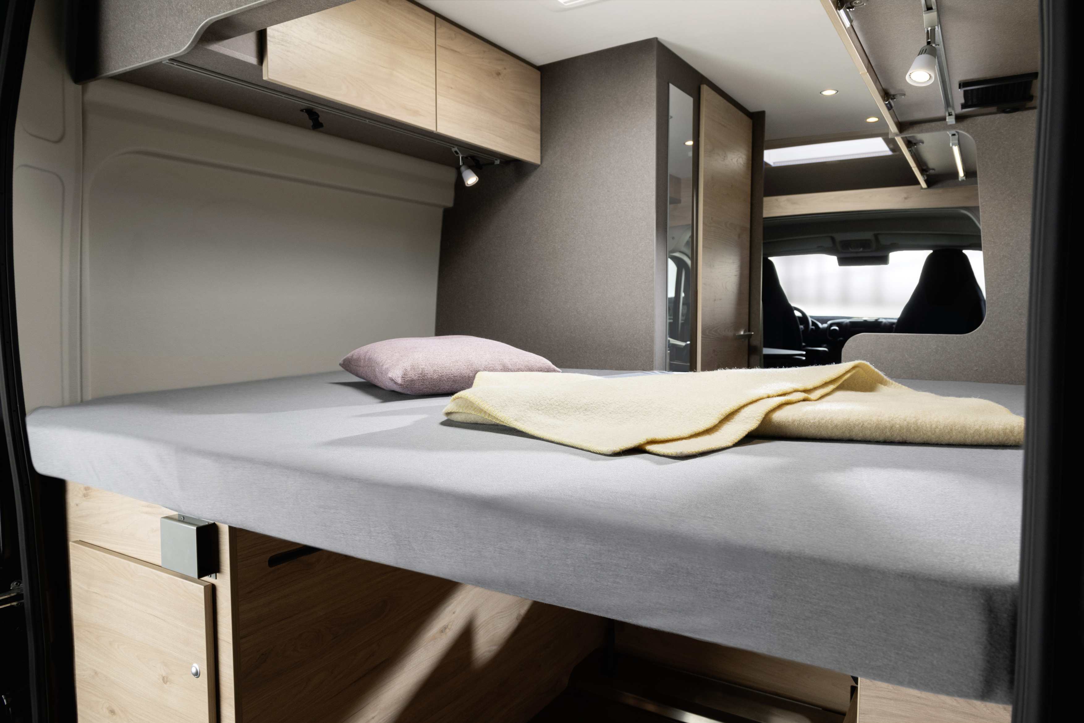 Achterin is een slim opbergsysteem met lades en vakken, terwijl de opstap in de camper ook als opbergruimte dient. Ingebouwde kleerkasten en sfeerverlichting fungeren ‘s avonds als instaplicht. Het innovatieve hefdak zorgt voor een extra slaapplaats met panoramisch uitzicht en muggenhor, ideaal voor gezinnen. Het nachtcomfort wordt versterkt door een hoogwaardige lattenbodem en een 6 cm dik koudschuimmatras. Cabine en woongedeelte zijn voorzien van draaibare stoelen, en de compacte, multifunctionele keukenmodule heeft een uitklapbare kookplaat, spoelbak en extra werkblad onder het aanrecht. Technisch valt de Active op door 16 inch lichtmetalen velgen, achteruitrijcamera, luifel, automatische airco, led-dagrijverlichting, lederen stuur en digitale boordcomputer.