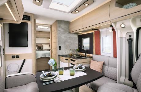Rapido heeft ook veel aandacht besteed aan het interieur van de Night Edition, met een nieuwe decoratie in de Luceo-sfeer, zwarte accessoires (stopcontacten, handgrepen) en een nieuwe Dubrovnik-bekleding met grijs gewatteerde stof.