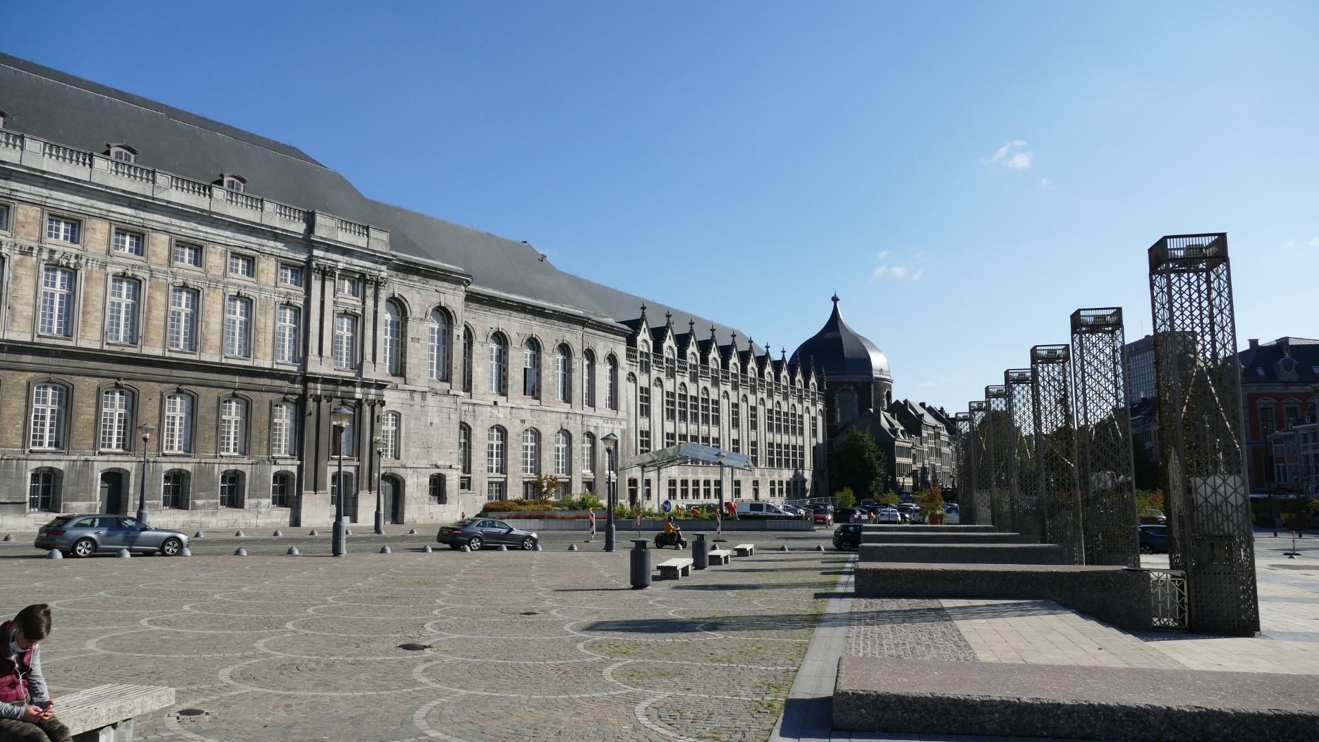 Tijd voor een koffietje op de Place du Marché. Zonder het te weten zitten we vlak naast de zuil van het ‘perron’ (met een pijnappel erbovenop, symbool van openheid en eenheid). Een perron is typisch in steden die ressorteerden onder het gezag van de prins-bisschoppen van Luik. Aan de zuil werden wetten en verordeningen uitgeroepen. Al in de 12de eeuw stonden afbeeldingen ervan op munten.