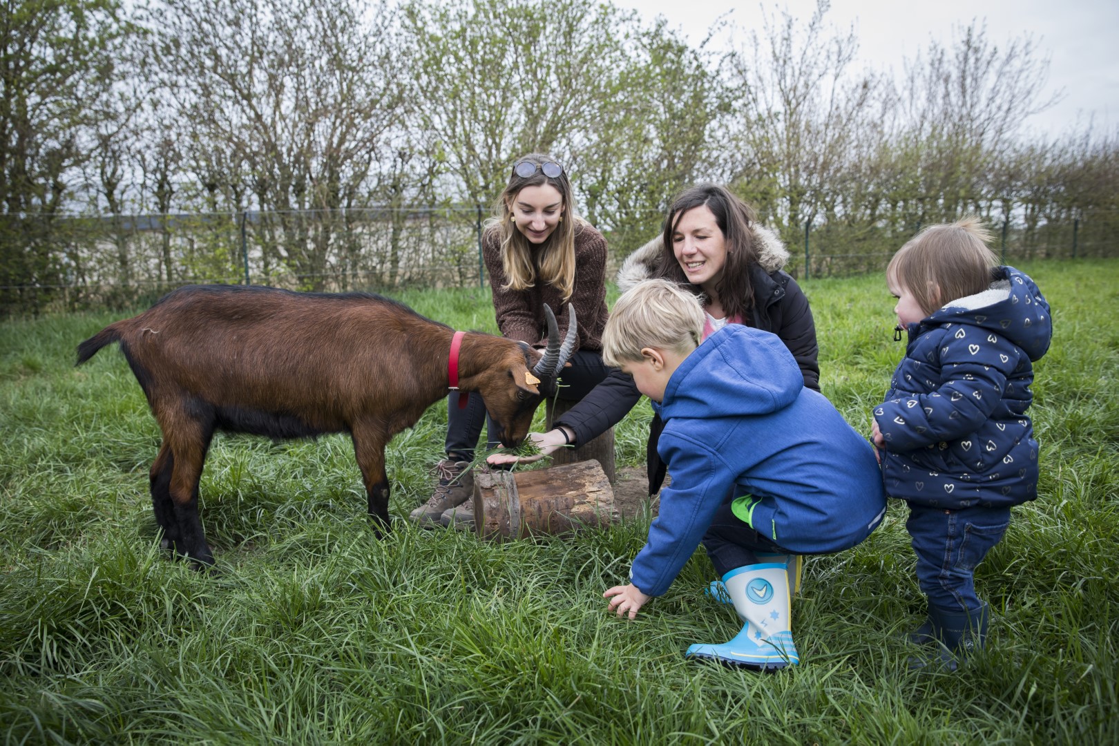 De dieren bezoeken, dat is waar Wout en Lara al van voor ons vertrek reikhalzend naar uitkijken. En Ruth en ikzelf stiekem ook. Dat kan doorheen de dag op verzoek samen met de uitbaters. Daarnaast krijgen de beestjes twee keer per dag te eten. Op die momenten kan je aansluiten om te helpen. Aangezien de eerste voedingssessie samenvalt met het ochtendgloren, verzamelen gasten in de praktijk vaak pas in de late namiddag of avond voor het klusje. Al kan je dit eigenlijk geen klus noemen. Als we de weide van geiten Floor en Marie betreden is het moeilijker om te zeggen wie er enthousiaster is - zij, bij het vooruitzicht van hun avondmaal, of wij, die in het dagelijkse leven amper in aanraking komen met viervoeters. ‘Kijk mama en Kristina, de geit eet uit mijn handen’, roept Wout wanneer geit Marie gras en korrels komt knabbelen. Zelfs Lara, die staat te wankelen op haar nieuwe laarsjes en amper boven de geiten uitkomt, voelt zich veilig genoeg om met volle teugen te genieten van deze voor haar knotsgekke situatie. Wij glunderen mee. En dan moeten we nog passeren bij de schapen met lammetjes, bij de konijnen en cavia’s, de kippen en paard Vero.