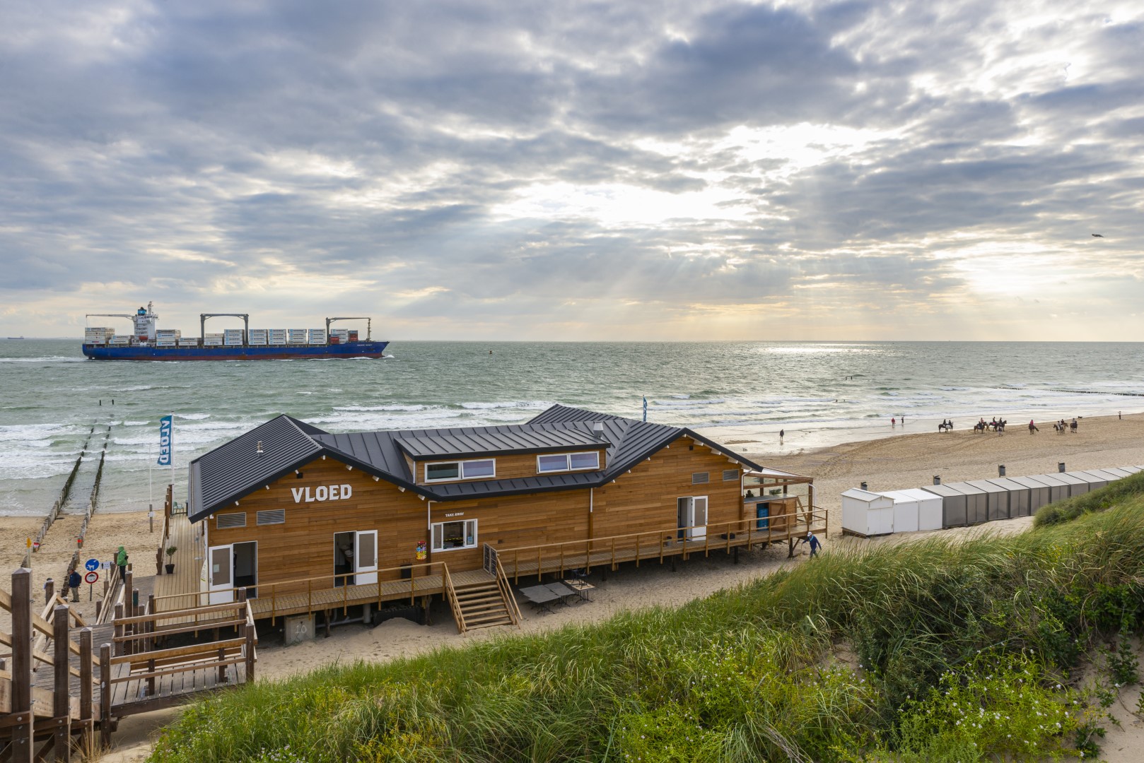 Een golvende houten strook staat als een sculptuur in het Voornes Duin, op het Zuid-Hollandse eiland Voorne-Putten. Achter de glazen pui zitten mensen aan tafeltjes, verlicht door lampen van rood, blauw, groen en geel glas. Het uitzicht: duinen, de Noordzee en daarachter de Maasvlakte, een industriegebied dat deel uitmaakt van de Rotterdamse Haven. Tussen het stadse leven en beschermd Natura 2000-gebied staat Restaurant Aan Zee als ultiem voorbeeld van duurzaamheid.