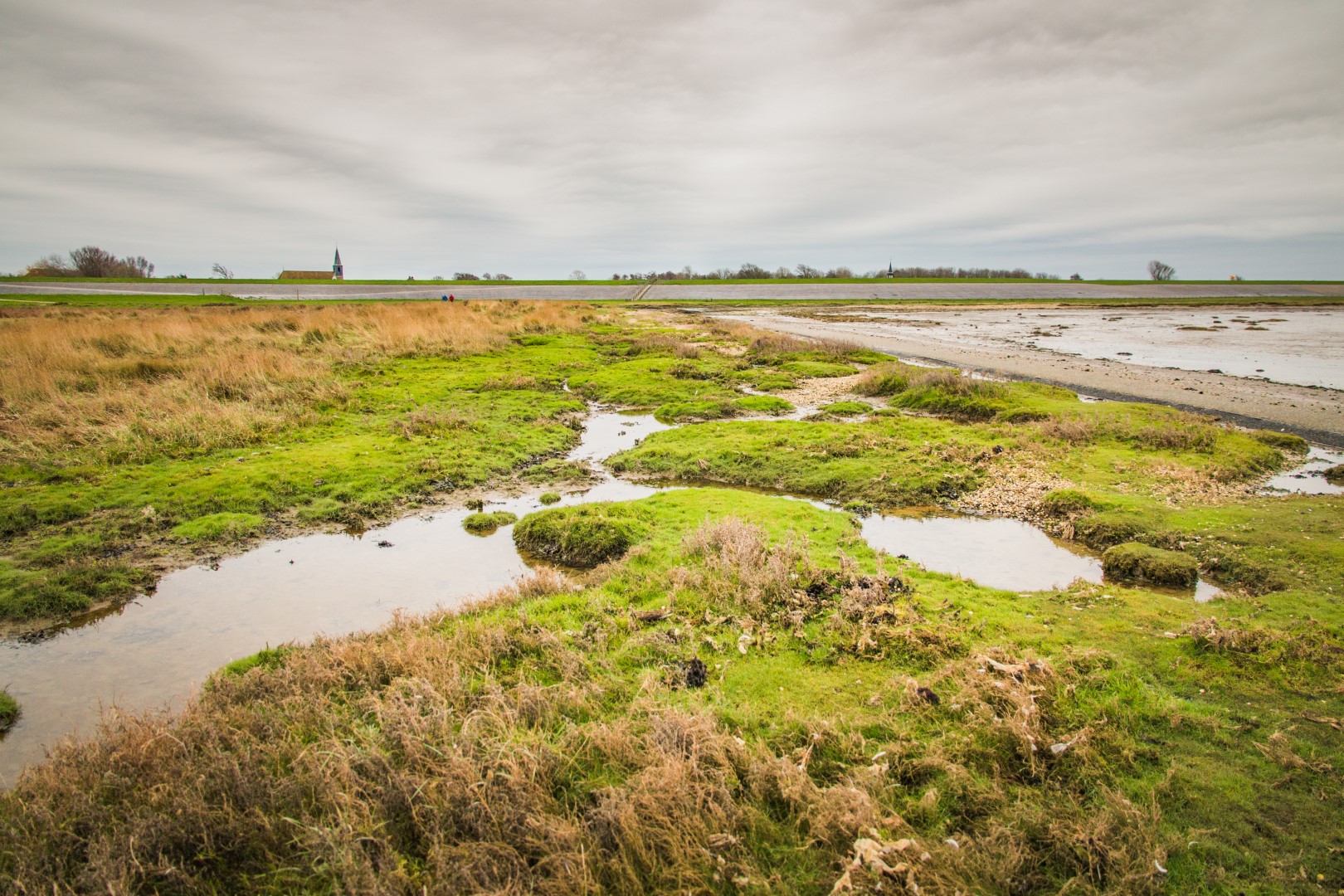 De twee samengevoegde dorpen zijn ontstaan uit de door de eeuwen heen gegroeide vissersgemeenschappen. Ik parkeer de auto bij het kerkje achter de dijk en wandel door de gezellige straatjes naar het wad. Bovenop de dijk strekt de Waddenzee zich uit. Het is laagwater en de twee kilometer lange pier ligt als een lange rechte weg in het slib. Een weg zonder een einddoel.