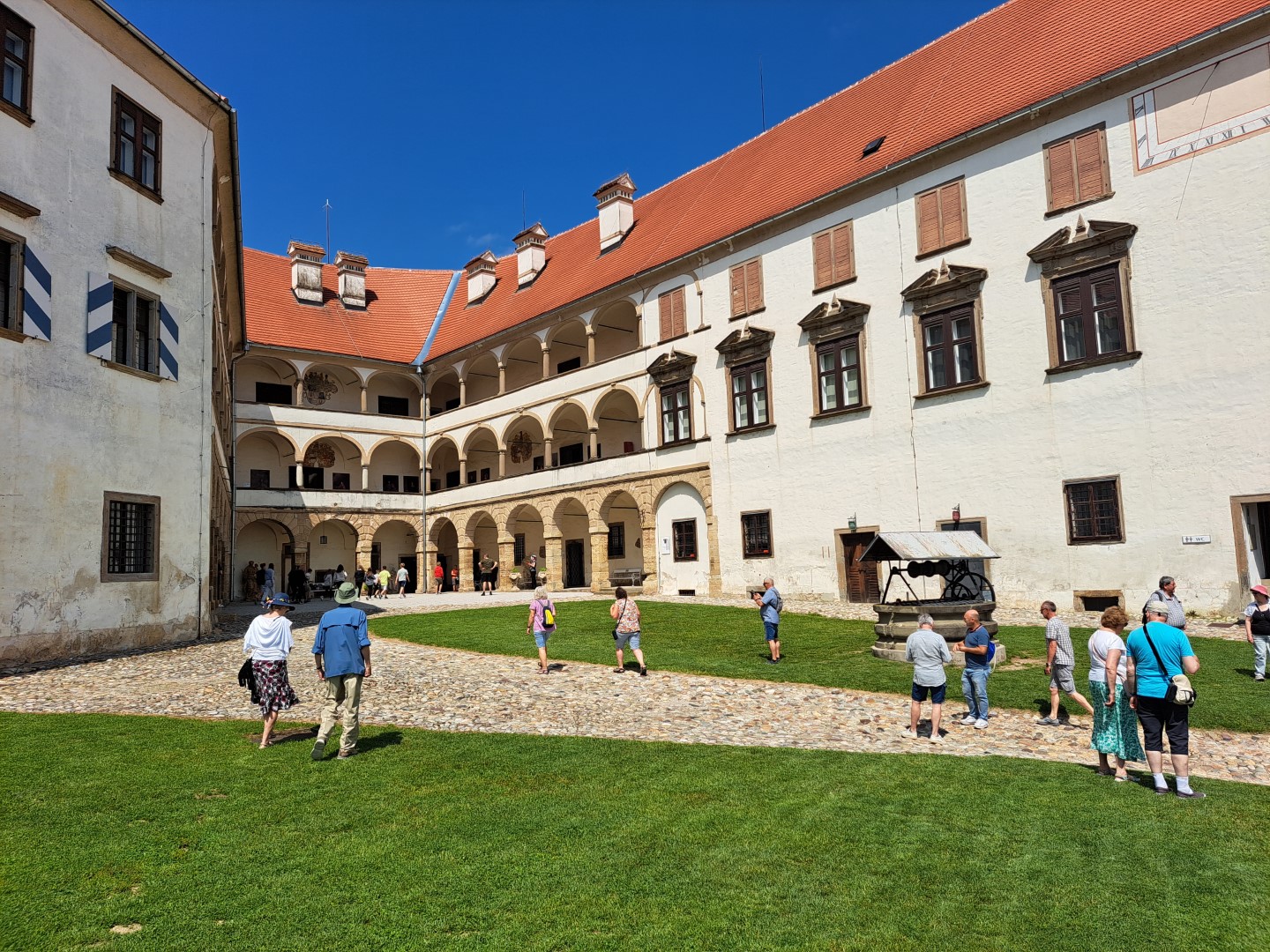 Over het wandelpad langs de Drava komen we als vanzelf in hartje stad terecht. Een heerlijk plein voor het stadhuis en schoon volk op straat, want het is zaterdag trouwdag. Drankjes, hapjes, gebabbel en lachende gezichten op de terassen. Een bandje koperblazers en een trekzak speelt vrolijke muziek. Van een blijde intrede gesproken…