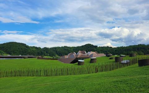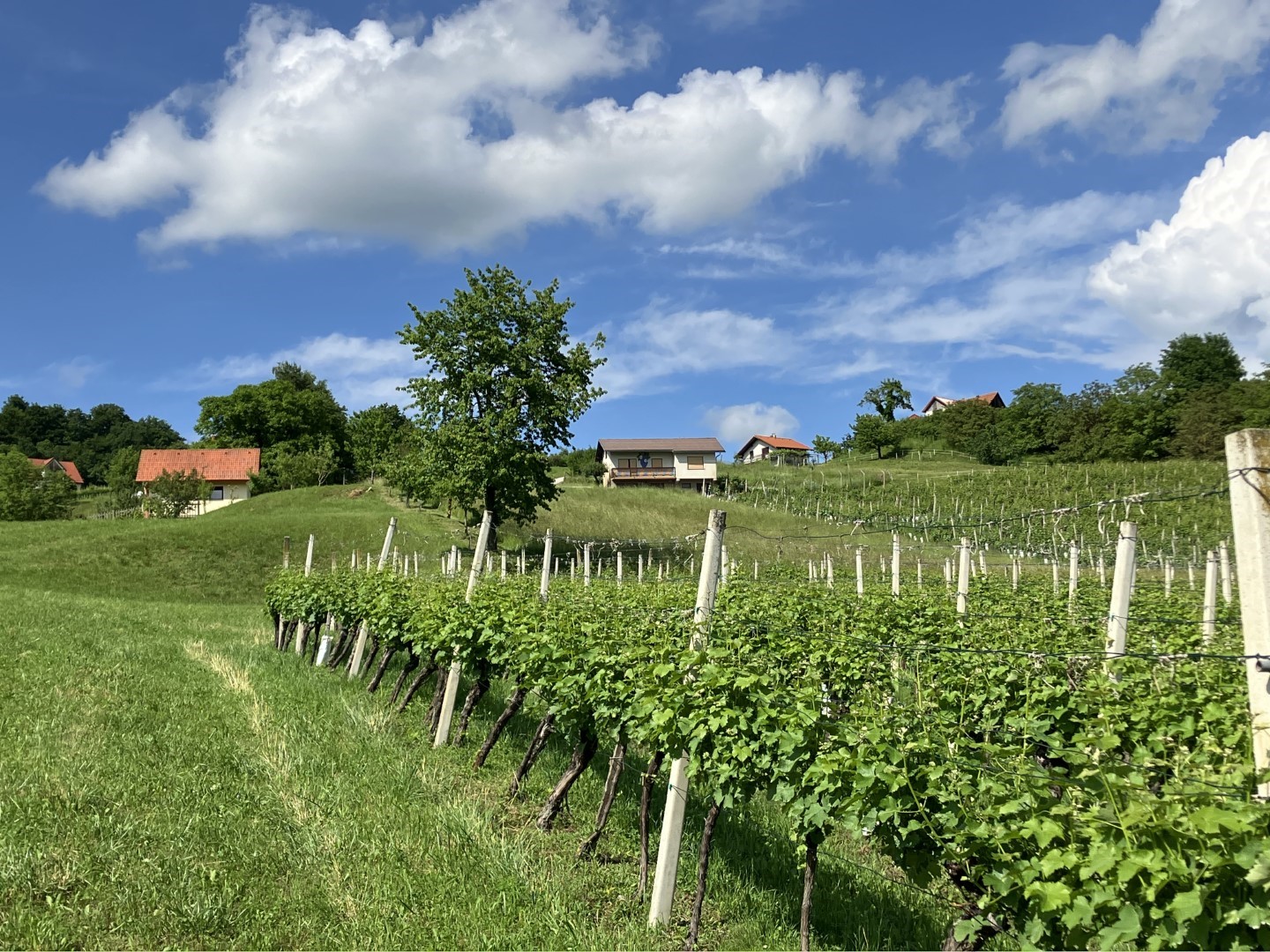 Blij dat we droog kunnen inpakken, de fietsen in de camper vastsjorren en met vers water en fris sanitair de baan op kunnen naar Podčetrtek voor een heel andere ervaring. Op de snelweg laat Slovenië zich van zijn vrolijke kant zien. Don’t think you are Roglič: zo gebiedt een elektronisch bord tot afremmen. Weg van de snelweg genieten we van een glooiend landschap, van wijngaarden en weilanden, van hoeves met rieten daken en knijpen we een oogje dicht voor industrie.