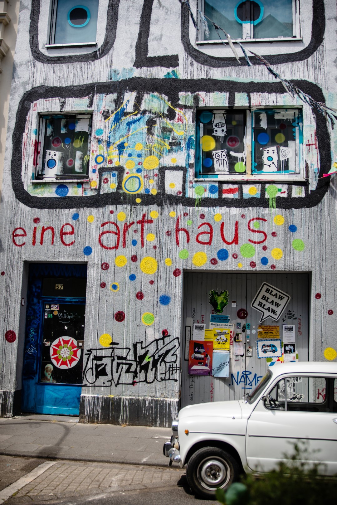 Onze camper hebben we geparkeerd op een parkeerplaats aan de Rijn. Het is gemakkelijker om met de tram het centrum in te trekken! Als we afstappen aan de Venloer Strasse, valt meteen op hoe levendig Ehrenfeld is. Elk Veedel heeft z’n eigen sfeer, trekpleisters en architectuur. De ziel van Ehrenfeld is duidelijk een neef van die van Berlijn. Deze wijk maakt nog maar sinds 1888 deel uit van de stad Keulen. Net zoals dat het geval is bij vele andere grote steden, was Ehrenfeld het grootste deel van de 19de eeuw nog een landelijk dorpje buiten de stad. Iets van die dorpssfeer is blijven hangen. Je voelt het aan de gezellige straten en steegjes, de ontspannen manier waarop buurtbewoners met elkaar zitten te keuvelen op bankjes en terrassen, en de vele kleinschalige winkels en horecazaken. Ketens zijn hier nauwelijks te zien.