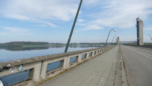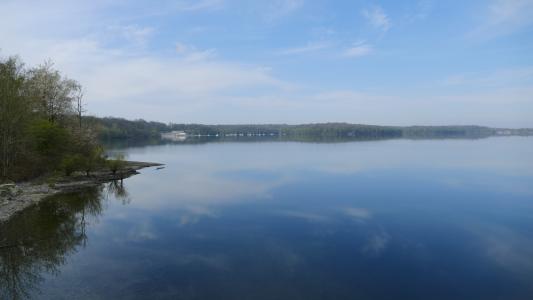 We rijden tussen Les Lacs de l’Eau d’Heure, het grootste merengebied van België, en houden halt voor de nacht op de Camping des Lacs. De volgende ochtend halen we onze fietsen van de camper en maken we een rit van 20 kilometer rond het oostelijke deel van het stuwmeer. De RAVeL wordt goed aangegeven en we rijden veilig op een apart fietspad over de contouren van het meer.