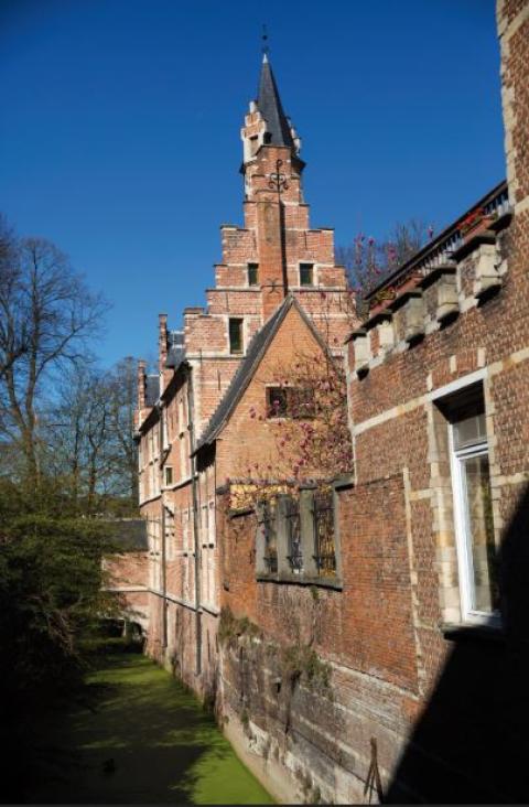 Het dak van dit schilderachtige gebouw is goed voor een onverwacht panorama over het begijnhof en de tuintjes, met de stadstorens in het decor en het gouden beeld van God de Vader op de voorgevel van de Begijnhofkerk in de aanpalende straat bijna binnen handbereik.