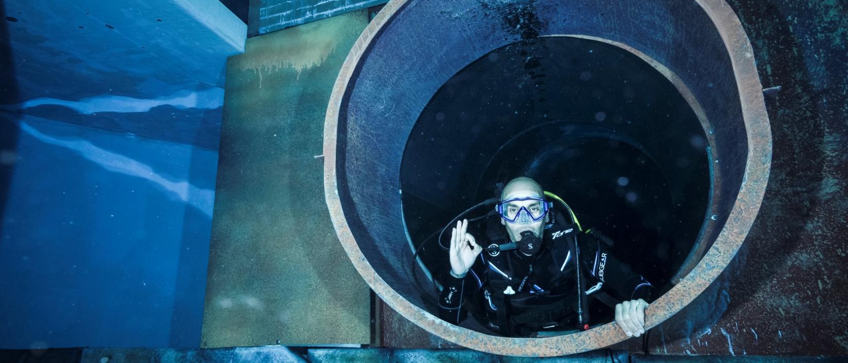 Ik dook in de duiktank op de site Transfo, een oude elektriciteitscentrale in Zwevegem. De unieke tank werd in 2015 in gebruik genomen als de grootste van Europa. Hij werd gebouwd in een immense stookolietank en heeft een diameter van 20 meter, een diepte van 15 meter en een watercapaciteit van 4,7 miljoen liter. Hij is ingericht met verschillende onderwaterplateaus en uitdagingen. Duiken in een tank is de perfecte tussenstap tussen duiken in een zwembad en duiken in open water. Leuk weetje: op 16 april 2016 vormden 112 duikers in duiktank Transfo de grootste onderwaterpiramide ter wereld.