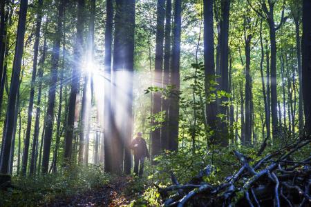 De mist hangt laag en romig tussen de lange beuken. In sierlijke lijnen lopen de stammen omhoog. In de verte vliegt een gaai krijsend weg, maar voorts is het hier stil. We staan midden in de sprookjesbossen van Vrouw Holle. Achter ons ligt de berg de Hoher Meissner en voor ons glooien de beboste heuvels van Noord-Hessen alle kanten uit.