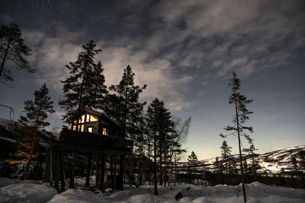 Ook onze volgende cabin blijkt een pareltje, maar wel eentje waar je geen hoogtevrees voor mag hebben. We logeren namelijk in een boomhut, met uitzicht op een donderende waterval. Wij zijn de enige gasten (de twee andere boomhutten werden beschadigd door een storm) en het voelt echt alsof we hier alleen op de wereld zijn. Ook op de sneeuwschoenwandeling die gastheer Ante ons aanraadt, komen we geen levende ziel tegen. De Vassfaret vallei is dan ook een verlaten bergvallei, amper 30 kilometer lang, waar houtkap lang de belangrijkste activiteit was. Het gebied werd enkel bewoond door een handvol boeren, arbeiders en bruine beren. Of we bang moeten zijn een grommend exemplaar tegen het lijf te lopen? Ante stelt ons gerust: sinds 1972 kan je de dieren enkel nog in het Vassfaret berenpark bewonderen. Noorwegen telde ooit meer dan drieduizend wilde beren, tot er een wet werd uitgevaardigd die een premie beloofde aan elke jager die een beer kon schieten. De berenpopulatie daalde drastisch en de laatste beren verscholen zich hier in de Vassfaret vallei. Pas in 1973 kreeg de beer de status van beschermde diersoort in Noorwegen, maar toen was er amper nog een beer te vinden. Triest, maar toch ook een tikkeltje geruststellend… Wij sluiten het jaar niet af met vuurwerk of luide muziek, wel met sleeën, sneeuwengels maken en samen naar de sterren staren. We delen onze wensen en dromen terwijl de wind onze boomhut soms vervaarlijk doet kraken. Euh, halen we dat nieuwe jaar toch nog wel?