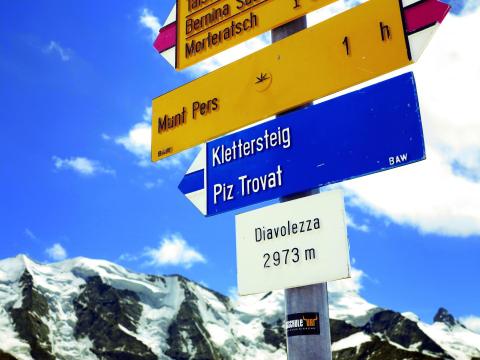 Paul blijft bij ons voor de afdaling over een ander rotspad. Zonder kabels dit keer, wel met helm. Met zicht op gletsjers, stil dreigende bergtoppen en eeuwige sneeuw drinken we nog een glas op het terras van het Diavolezza bergstation.