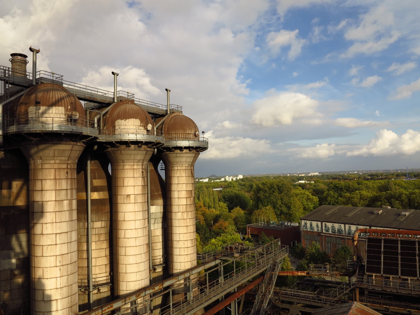 Terwijl we de oven beklimmen vertelt Stephan over het opzet van Landschaftspark Duisburg-Nord: ‘Elders in het Ruhrgebied gaat het over de geschiedenis van de staalindustrie. Hier leggen we de klemtoon op vrije tijd en ontspanning. Je kan wandelen, sporten of een paar uur in de touwen hangen op een avonturenparcours. Bij de bergsportvereniging kan je muurklimmen. De openluchtcinema kan bij regen zijn schuifdak sluiten. En ’s avonds zijn de industriële installaties kleurrijk verlicht. Een walhalla voor fotografen!’