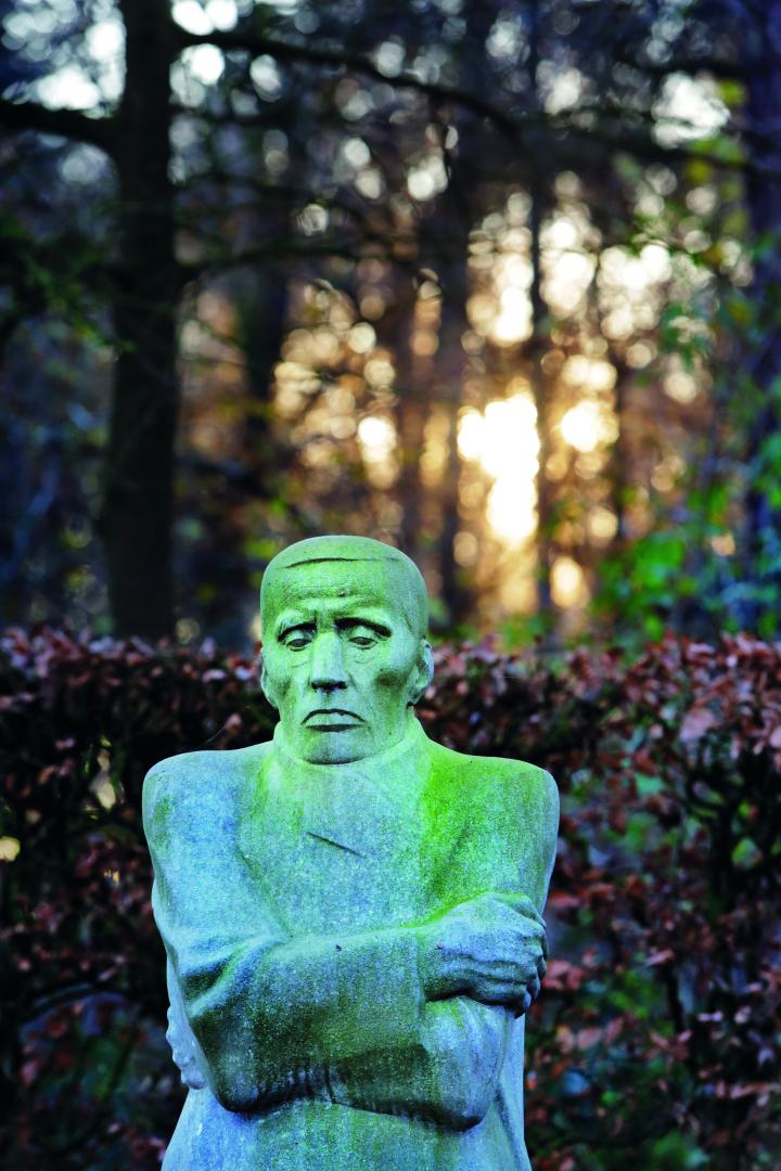 Regelmatig zitten er Duitse bezoekers rond hun kachel, terwijl André in dikke registers een naam zoekt. Het schemert al wanneer we eenzaam naar de beeldengroep Het Treurend Ouderpaar wandelen. Dat duurt zijn tijd, want de sculptuur staat helemaal achteraan op de begraafplaats.