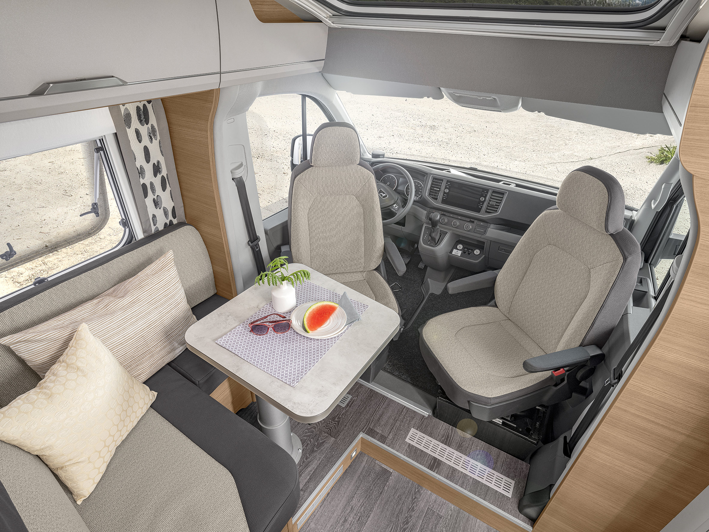 Het interieur is modern en gezellig dankzij het gebruik van licht hout in combinatie met warme, witte oppervlakken voor de kasten en schuifladen. Inclusief bijpassende stoffen en optioneel Fiat kabinetstoelen in dezelfde stof.