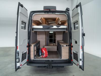 Bij de nieuwe Boxdrive XL slaat de ‘XL’ niet op zijn lengte, die is 600 cm, maar wel op zijn verhoogde GFK-dak. De op MAN TGE 35 gebouwde buscamper heeft achterin een dwarsbed dat je in de hoogte kan regelen, om bijvoorbeeld fietsen binnen te vervoeren. Je kan er ook met vier in slapen. Het verhoogde dak laat dit toe. Het zogenaamde ‘comfort slidebed’ is een systeem waarbij je twee planken boven de stuurcabine op elkaar legt. Wil je ze omvormen tot een bed, dan schuiven beide planken via een rail naar achteren. Mooie en praktische vondst! Het verhoogde dak is geïsoleerd en voorzien van een dakvenster. Het keukenblok heeft de koelkast onder het aanrecht en is ook van buitenaf bereikbaar. In de badkamer noteren we een draaibare douchewand.