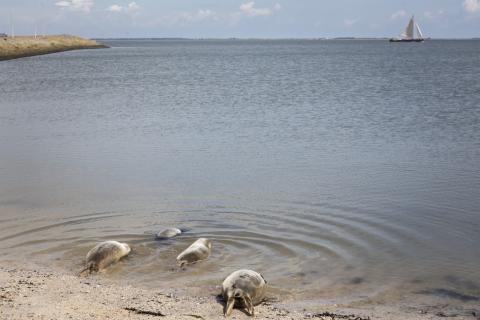 Dan maar naar het zeehondencentrum van Pieterburen, een beetje verderop. Dit opvangcentrum is het grootste ‘zeehondenziekenhuis’ van Europa. Verdwaalde, verzwakte en gewonde zeehonden worden hier verzorgd tot ze weer sterk genoeg zijn voor het leven in zee. Je kan er de verzorgers aan het werk zien, een rondleiding achter de schermen volgen of meegaan op ‘zeehondensafari’ op de Waddenzee. Het centrum kan op veel bezoekers en sympathie rekenen - er werken vrijwilligers van over de hele wereld - maar ook op kritiek. Er zouden té veel dieren onnodig opgevangen worden. Een aangespoelde zeehond op het strand lijkt misschien zielig of in nood, maar is het daarom niet. ‘De zeehondenpopulatie is niet bedreigd, dus om die reden is het inderdaad niet nodig om zeehonden te redden’, zegt Emmy Venema, die in het zeehondencentrum werkt. ‘We rukken alleen uit als we melding krijgen van aangespoelde of gewonde zeehonden, én we houden ze niet langer dan nodig bij ons. Doel is altijd om ze zo snel mogelijk weer vrij te laten.’ We gaan met haar mee naar een stukje strand in de haven van Lauwersoog, waar vier zeehondjes na drie maanden in de opvang weer naar huis mogen. Een team vrijwilligers zwaait Carla, Daisy, Roelof en Sylvia Earle uit - elke zeehond krijgt bij aankomst een naam. Er wordt geknuffeld en zelfs een traan weggepinkt. Wij hopen vooral dat de beestjes een deugddoend verblijf in Pieterburen achter de rug hebben, en een verder gelukkig leven tegemoet zwemmen.