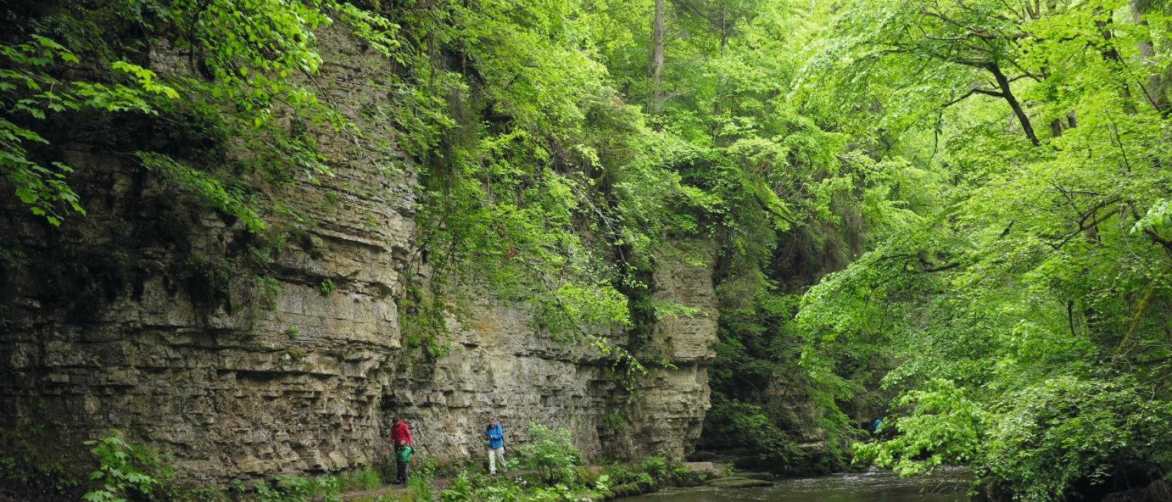 Von Scheffel trok al met plezier door de toen moeilijk toegankelijke Wutachschlucht, vandaag maakt de Schluchtensteig het je iets makkelijker. Ik loop langs weiden en loofbos Aselfingen voorbij, volg de brede Bühlerweg door een bos en kom uit bij de samenvloeiing van Wutach en Gauchach. Hier wordt het opnieuw spannend. De Wutach mag dan al breed door de kloof meanderen, ik wandel er wel met mijn schouder langs steile rotswanden over een smal pad.