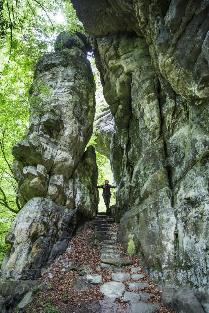 Hoewel dit stuk terug richting Echternach jammer genoeg parallel met de autobaan loopt, laat het trail zich nog een laatste keer van zijn mooiste kant zien. Als oude mannen staan de zandstenen rotsen voorover gebogen naar hun tenen te staren. We zigzaggen door het Labyrinth. Overhangende rotsen als waterspuwers lijken een verborgen stad prijs te geven. En dan stappen we pardoes de Wolfsschlucht binnen, ofwel de Gorge du Loup, het keelgat van de wolf. Tussen deze metershoge verticale rotswanden zouden roedels wolven zich hebben teruggetrokken om zich tegen jagers te beschermen. Alles zit onder een laag fluorescerend groen mos. Klimop kruipt tussen de afgebrokkelde rotsen. Langs uitgehouwen treden wandelen we voorzichtig naar beneden.
