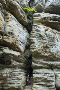 Enkele tientallen meters stappen we in het schijnsel van onze koplampen voetje voor voetje verder. Terug in het daglicht staan we op de bodem van een smalle canyon. De steile muren van de Rittergang lopen op het breedste punt zo’n anderhalve meter uit elkaar. Een enorm rotsblok zit boven onze hoofden geklemd in de spleet. Het zandsteen voelt koud en vochtig, het mos zit als een spons volgezogen met regenwater.