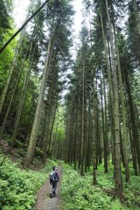 We wandelen verder over het trail, een ros tapijt van verdroogde blaadjes. Hoewel het een wat grijze dag is, priemt de zon toch geregeld door de kruinen van de bomen. Ze maakt de jonge beukenblaadjes bijna doorzichtig. Uit een dode boom schiet een bonte specht weg. Achter het kleine gat horen we het hongerige gepiep van de spechtenkuikens. Overal hangt het gefluit van vogels in de lucht. De natuur maakt zich duidelijk klaar voor de zomer. Naast een ideaal wandelgebied is het Mullerthal ook een klein paradijs voor vogelspotters en plantenliefhebbers. Het vochtige klimaat, veel schaduw en de humusrijke bodem zorgen voor meer dan vijftig varensoorten en door de kalkrijke ondergrond groeien er zelfs enkele soorten orchideeën.