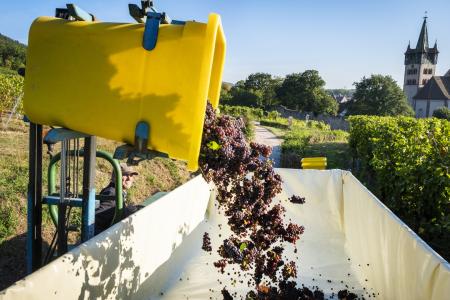 We wandelen langs de oude omwalling en het kleurrijke kerkje van Châtenois. Wijngaarden lopen in parallelle lijnen de heuvels af net tot aan het dorpje. De druivenplukkers zijn al vroeg aan het werk. ‘Uit Spanje’, antwoordt de ene op onze vraag waar ze vandaan komen. ‘Roemenië en Portugal.’ Allemaal snijden ze behendig met een kleine snoeischaar de rijpe trossen af van de ranken. Smalle tractoren rijden voorzichtig tussen de planten door en verzamelen druiven.