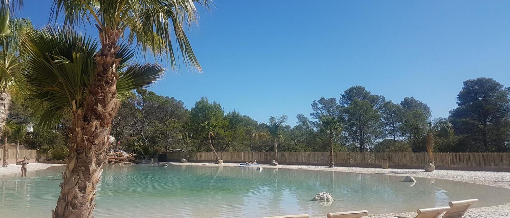 De ruime camping ligt op twee heuvels waartussen een dal met een beekje. Ooit was hier een steengroeve van de Romeinen. De staanplaatsen liggen goed beschut tussen de natuurlijke begroeiing op een hoger gelegen plateau, onder hoge bomen. Caravans mogen niet langer zijn dan 7 m. Er is een zwembadencomplex en een fraaie lagune met erom heen een zandstrand. De sport- en speelvoorzieningen, de winkel en het restaurant liggen in het dal. In het hoogseizoen rijdt een gratis bus naar het strand.