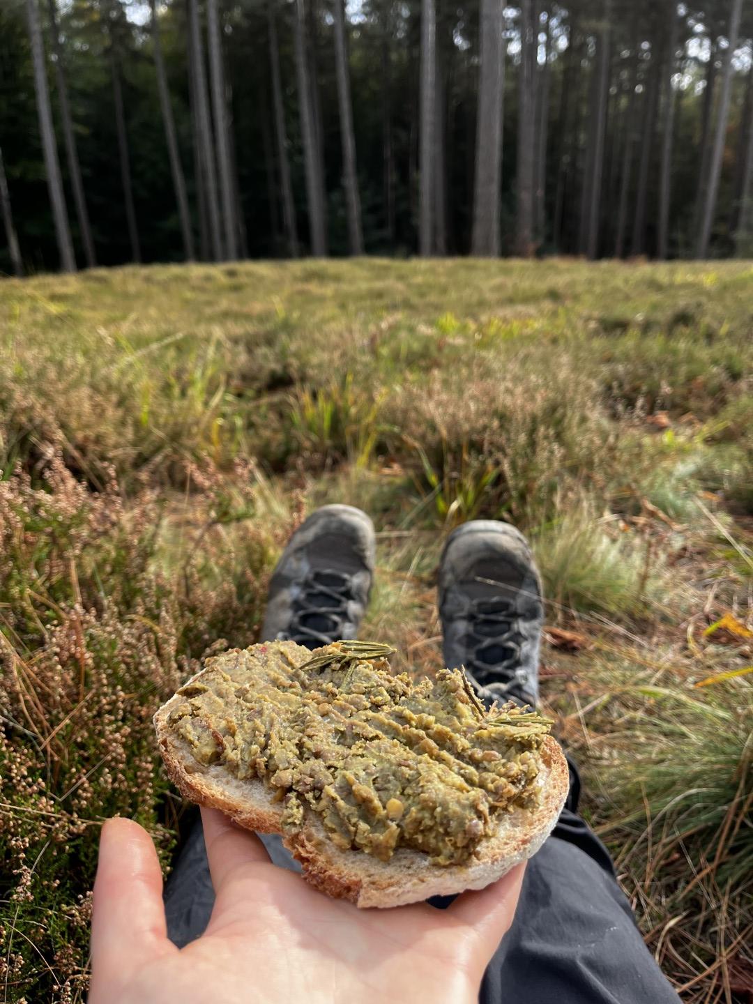 Als we de bocht omslaan, zien we de shelter van het Mollendaalbos met een prachtig uitzicht op een ravijn vol gevallen bladen. Dat vraagt om een snack, want na 10 kilometer worden we herinnerd aan het gewicht van de rugzak, met vermoeide voetzolen en een aanzwellend hongergevoel. Gelukkig is er keuze genoeg aan picknickbanken onderweg. Maar voor we echt pauzeren, willen we nog wat kilometers doen. We steken de Naamsesteenweg over via de wandelaarsbrug en stijgen naar de Tomberg, waar we ons neerleggen in de heide en lunchen in de zon en de wind.