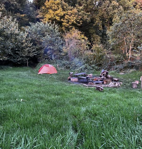 De kilometers beginnen goed op te lopen, maar dan komen we aan de bosrand waar een pijltje de weg wijst naar bivakzone ‘Het Spoor’. Zodra we gaan zitten op de boomstammen op het grasveldje, slaat de vermoeidheid toe. Onze schouders trekken, onze voeten kloppen, maar we zetten nog even in automatische piloot de tent op. We hebben ook geluk, want een Slovaakse familie is net klaar met een namiddagje bbq’en en laat het kampvuur voor ons smeulen. Dat zal nodig blijken, want zelfs op milde herfstdagen koelt het snel af nadat de zon ondergaat. En dat zal niet lang meer duren.
