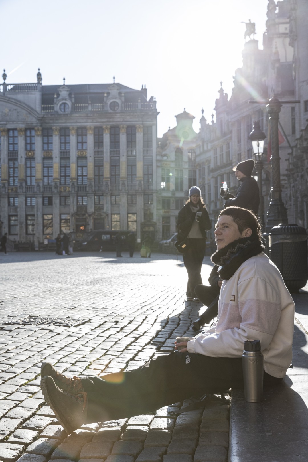 We dalen af richting Brussel-Centraal. De route neemt ons mee langs de kathedraal van Sint-Michiel en Sint-Goedele, waar de bomen op het plein geduldig wachten tot de Brusselaars weer komen lummelen in hun schaduw. In de Bergstraat, één van de oudste straten van Brussel, laten we onze blik glijden over honderden flesopeners, sleutelhangers en sierborden met Manneke Pis achter de etalages. Rommel voor ons, misschien, maar voor de miljoenen toeristen die jaarlijks onze hoofdstad bezoeken, zijn het souvenirs. Met de stem van Johan Verminnen in ons hoofd - je kan niet níet aan de man denken - slaan we de Rue des Bouchers in. De stank van vis, vuilnis en alcohol doet ons snel doorstappen. Van een bruisend Brussel is niet veel te merken in het middeleeuwse steegje, toch zeker niet op een maandagochtend. We bereiken de Grote Markt, waar toeristen braafjes achter gidsen met opgestoken paraplu’s lopen. We drinken een kop thermosthee op de stoeprand voor het stadhuis en genieten van de zon op ons gezicht. De route leidt ons niet langs Manneke Pis - al kan je gerust even afwijken - maar dwars door de Agoragalerij. Ooit een prestigieus paleis met de grootste bioscoop van Brussel, vandaag een overdekte winkelstraat vol schreeuwerige verlichting, flitsende nagelstudio’s en rekken vol namaakkleding. Buiten, aan de voet van de Kunstberg, schuifelt een oude man, wankel op kapotte schoenen. Hier en daar liggen mensen te slapen op de koude straatstenen, verstopt in een slaapzak of onder een stuk karton, maar je hoeft je best niet te doen om ze te vinden. Ook dat is Brussel.