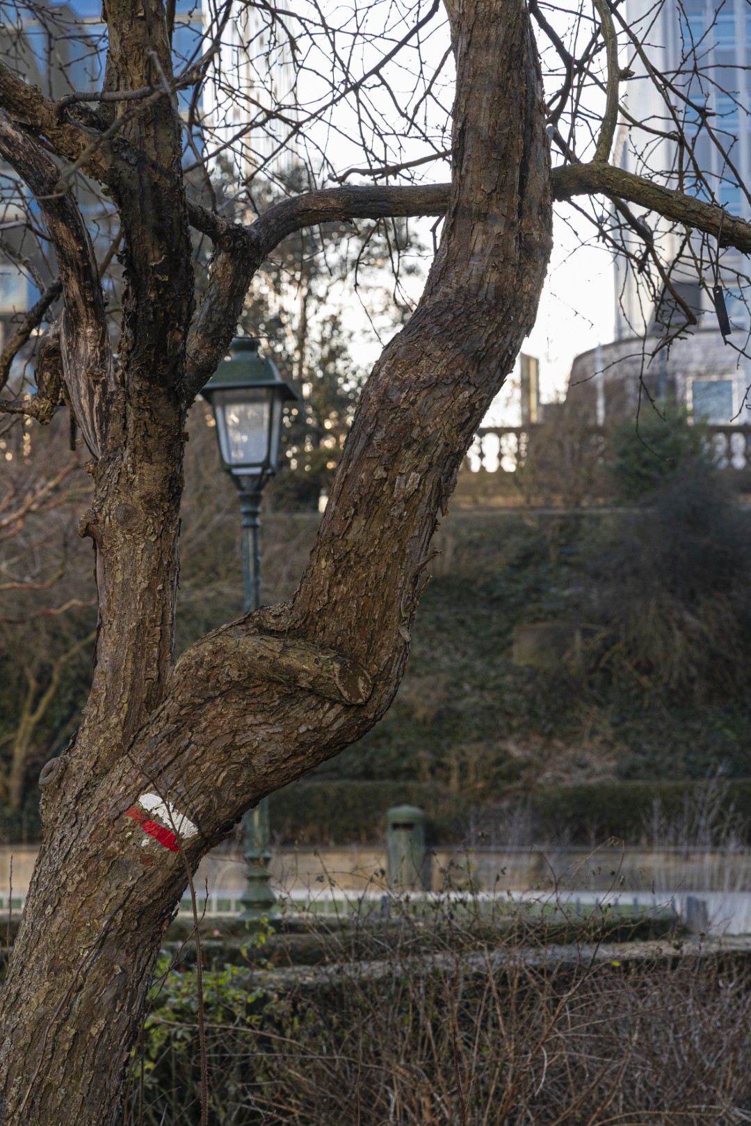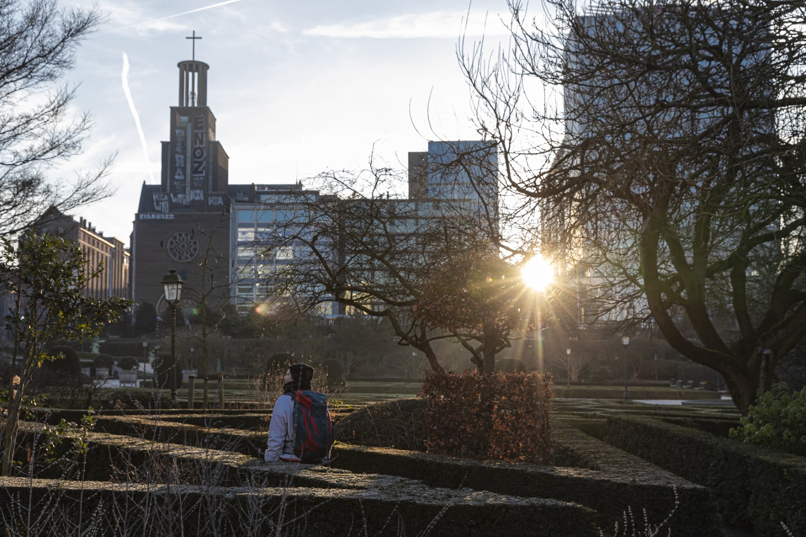 Het besef dat we gelukzakken zijn die vandaag vrolijk en vrij mogen rondfladderen door Brussel, groeit nog meer als we de Kruidtuin in wandelen. Op de struiken en de vijver ligt een dun laagje ijs, zoals het hoort op een koude winterdag. Op de paadjes is amper een mens te zien. De omliggende kantoorgebouwen - ze hebben iets weg van gestapelde Tetrisblokjes - kleuren oranje door de zon. Na de drukte in het Noordstation voelt deze plek als een verademing, ook al bonkt de stad keihard op de deur. De website Brussels Gardens verwoordt het treffend: de Kruidtuin is een groene ruimte die geklemd zit in het verkeersweb van de Brusselse Noordwijk. In het park fluiten de vogels, buiten de hekken horen we het verkeer razen. Wandelen in de stad is een verhaal van contrasten. Van grijs versus groen, van lelijk en schoon, van stilte en rust in parken tot ergernis en wrevel op straat. We filteren het achtergrondgeluid even weg en focussen op de historische tuin met prachtige orangerie, een pronkstuk gebouwd in de jaren 1826-1829. Waar ooit wetenschappers zich over exotische plantensoorten bogen, worden vandaag concerten en tentoonstellingen georganiseerd in ‘De Botanique’, het Cultureel centrum van de Franse gemeenschap. We maken even dankbaar gebruik van de openstaande deur en de toiletten, waarna we ons weer in het leven langs de tramlijnen storten.