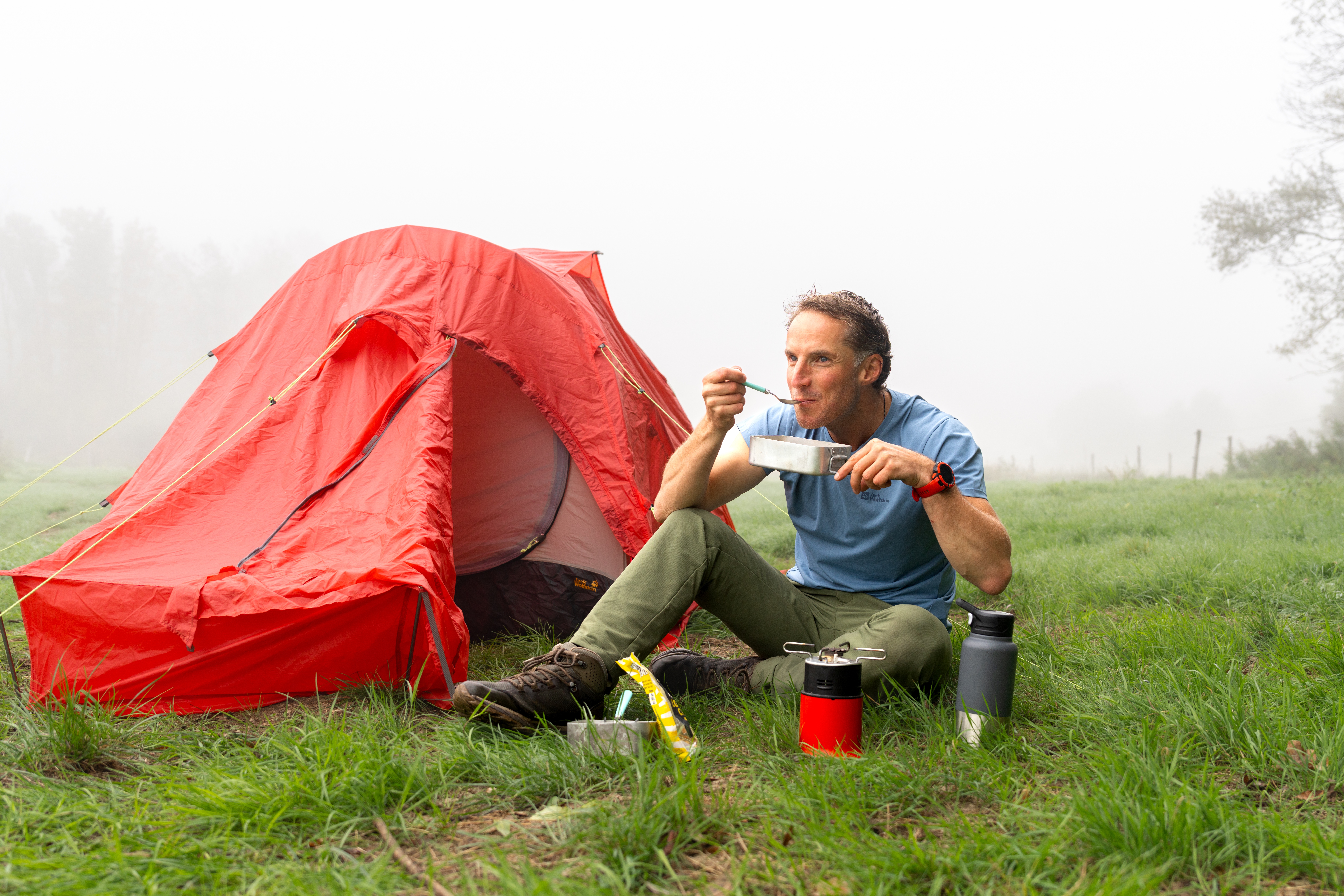 Voor mij draait een kampeervakantie met het gezin vooral rond samen genieten. Ik wil hen mijn eigen extreme manier van kamperen niet opleggen, dus hebben we een ruime familietent aangeschaft. Die heeft drie aparte slaapcompartimenten en een centrale leefruimte waar we kunnen koken, spelen of gewoon lekker samen relaxen. De camera blijft thuis, want ik vind het te lastig om tegelijk volledig aanwezig te zijn bij de kinderen én de omgeving vast te leggen op beeld. De ochtenden zijn mijn favoriete moment. Toen de kinderen kleiner waren, zaten we vaak al heel vroeg buiten om de stilte van de natuur te beleven. Nu ze ouder zijn, slapen ze liever wat langer uit (lacht). Het ontbijt is voor mij het mooiste kampeermoment van de dag: samen plannen maken, ontdekken waar we naartoe trekken en ruimte laten voor rust en verfrissing. Ik vind het belangrijk om de kinderen te leren hoe waardevol het is om dicht bij de natuur te leven. In onze maatschappij verdwijnt dat gevoel steeds meer, en dat vind ik spijtig.