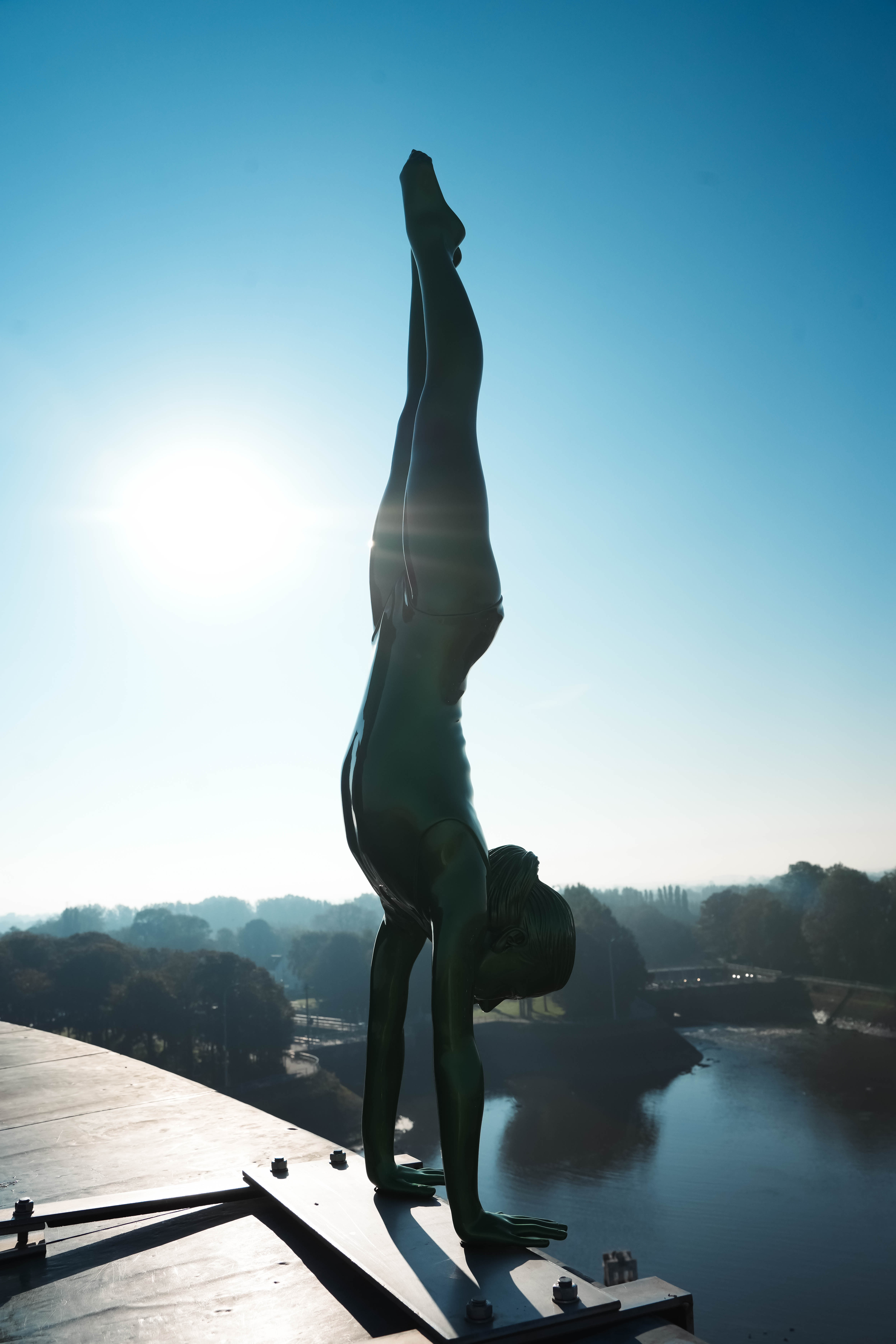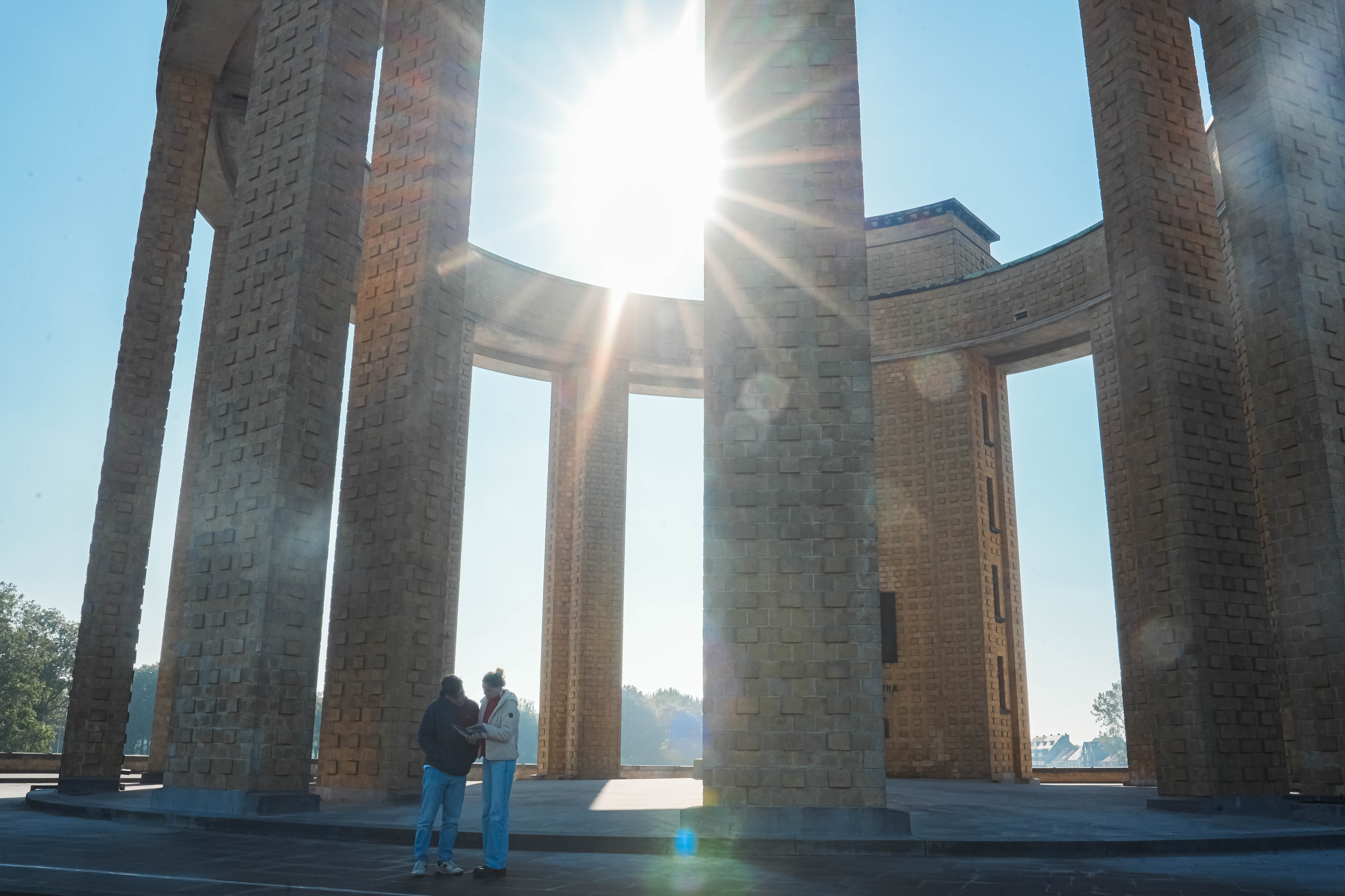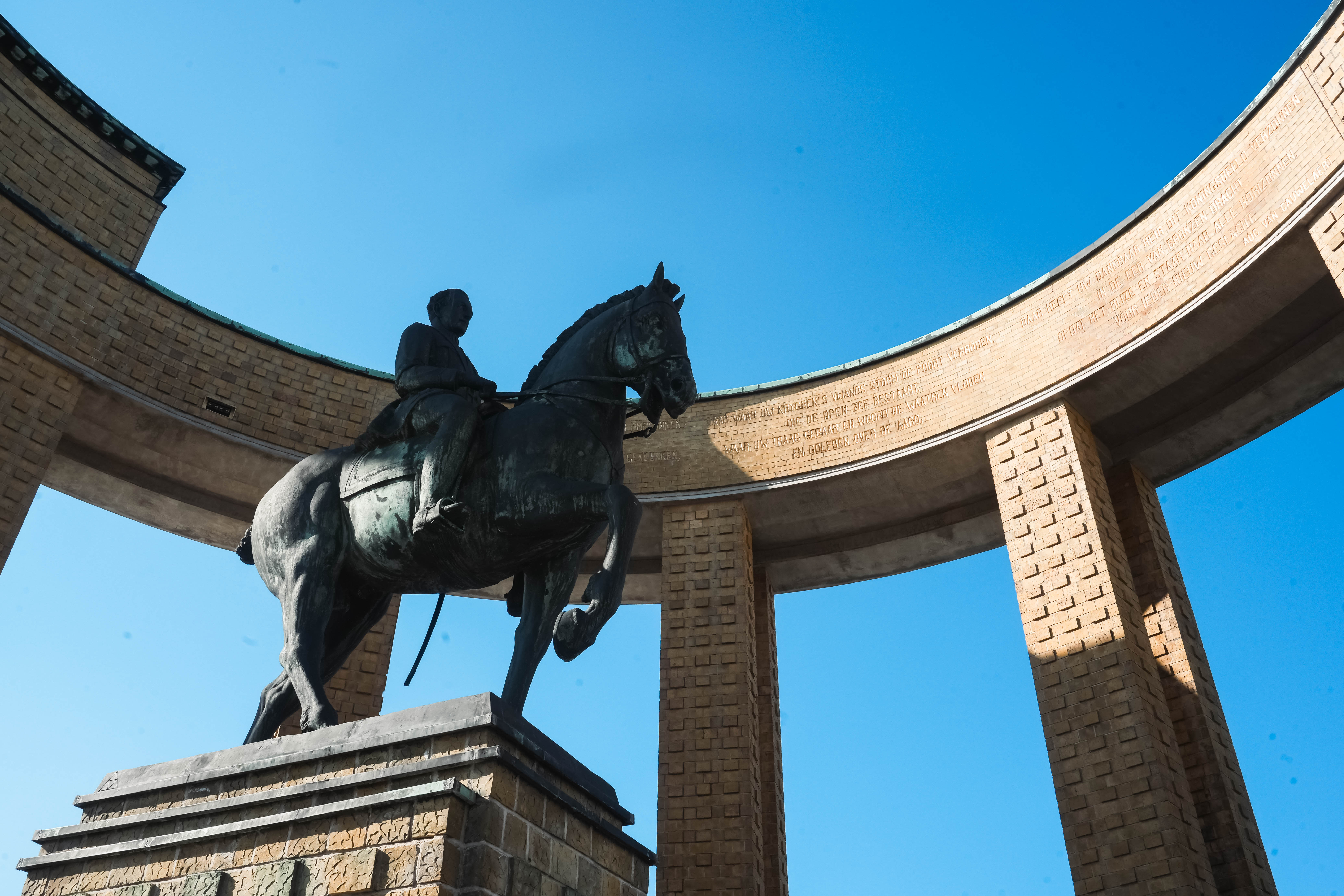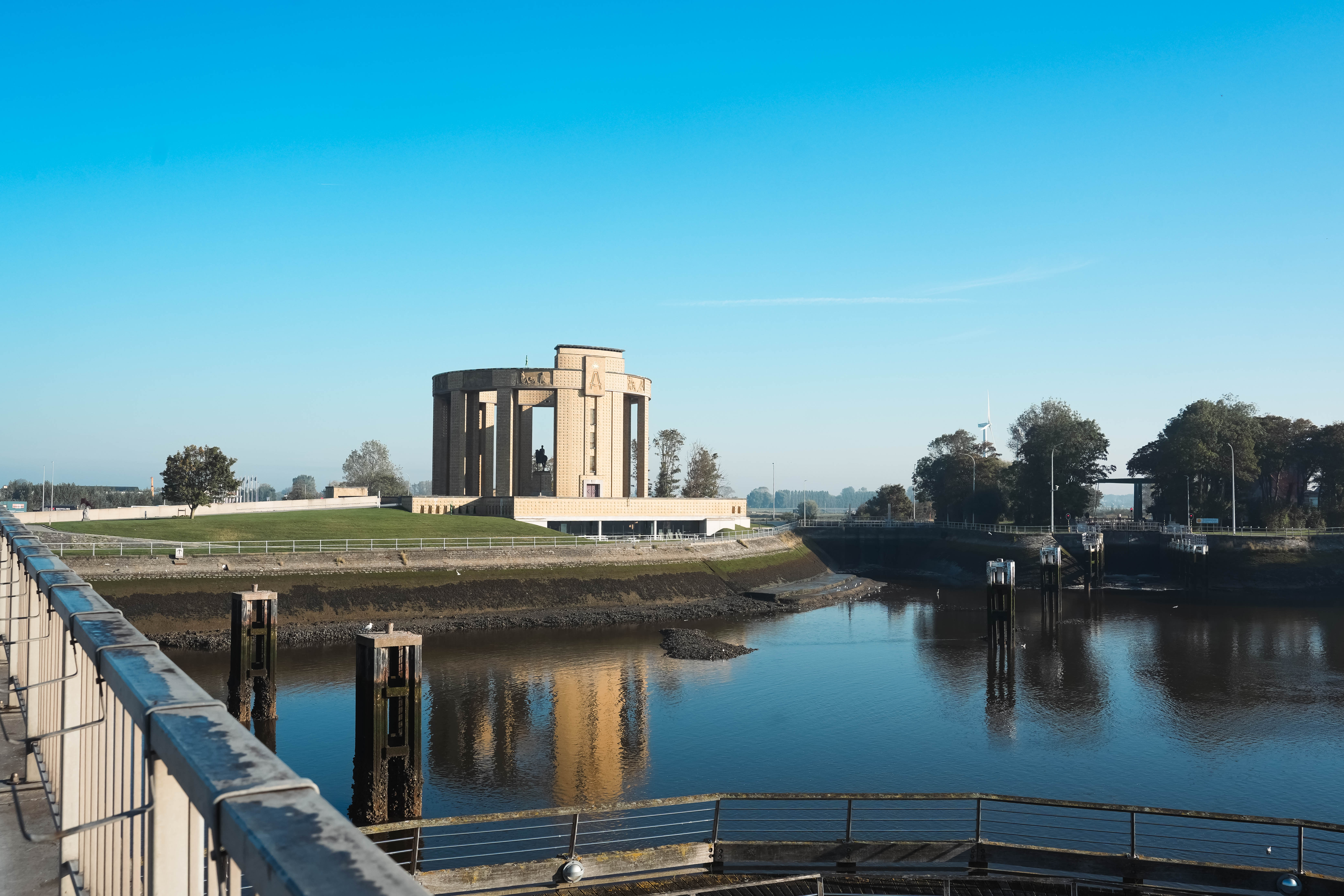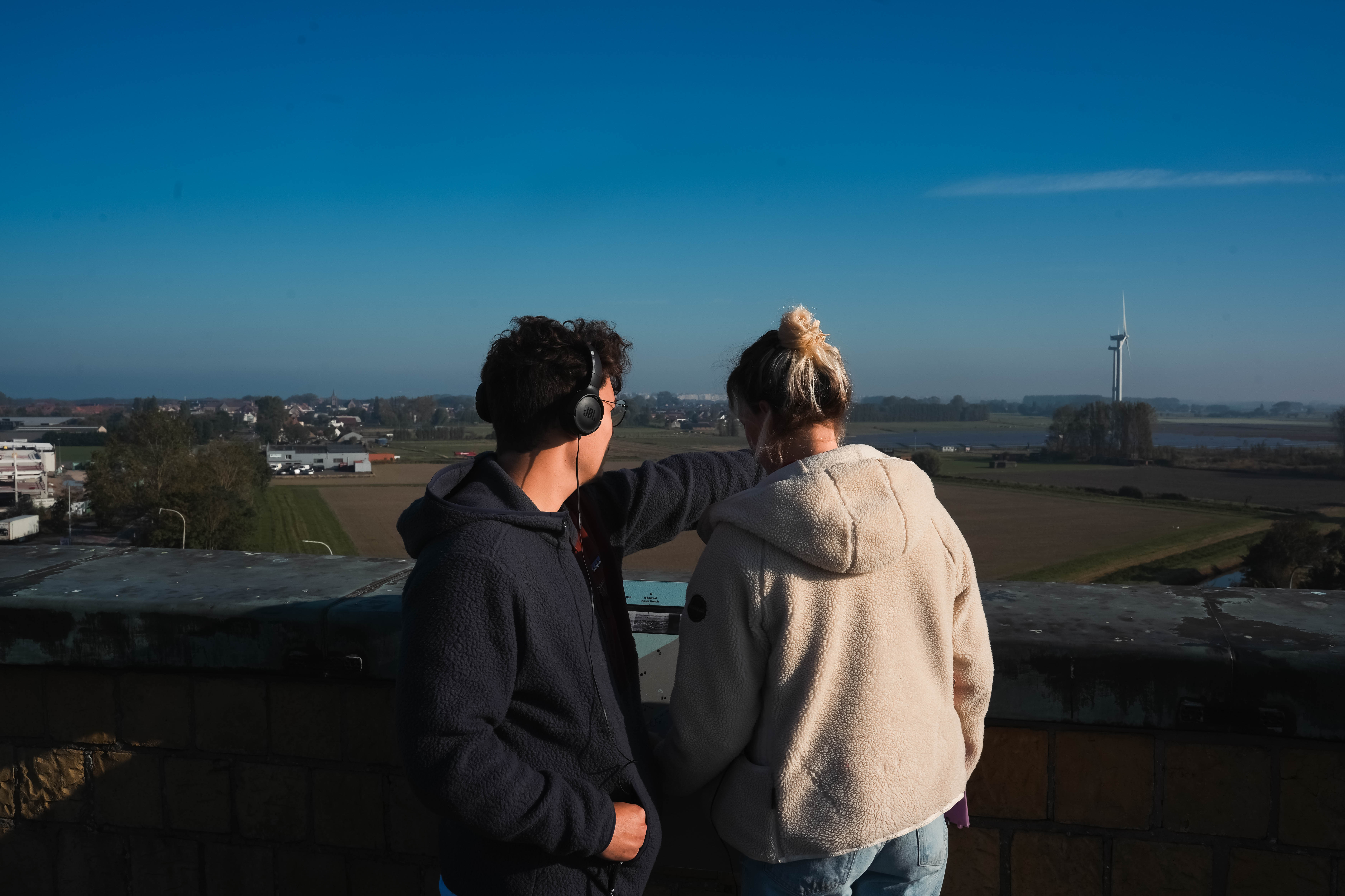 Ondanks de oktoberzon dalen de nachtelijke temperaturen onder nul. Wat we later op de dag leren over de ontberingen van de frontsoldaten op deze plek, helpt om de beroerde nacht te relativeren. Op nog geen tien minuten wandelen van Kompas Camping treffen we de Ganzepoot aan, het sluizencomplex waarmee de onderwaterzetting van de IJzervlakte werd aangestuurd. Het indrukwekkende Westfront, een oorlogsmonument ter ere van Koning Albert I dat tijdens de jaren dertig werd opgetrokken, schittert goud in de ochtendzon. Tijdens de honderdjarige herdenking van de Groote Oorlog werd er onder dit monument een bezoekerscentrum opgericht. Dat werd in 2024 volledig vernieuwd. Met behulp van een podcastwaardige audiogids herbeleven we de oorlogservaring van drie fictieve historische personages. Een korte zelftest helpt ons om een keuze te maken tussen het verhaal van Ellie, een verpleegster uit Brussel, Juul, een kunstenaar-frontsoldaat, en Rosa, een kind uit Nieuwpoort dat de tentoonstelling op kindermaat brengt. Hoewel de personages in enigszins genderstereotiepe rollen worden gepresenteerd, biedt de verscheidenheid aan perspectieven wel een verrijkende blik op de impact van de oorlog.