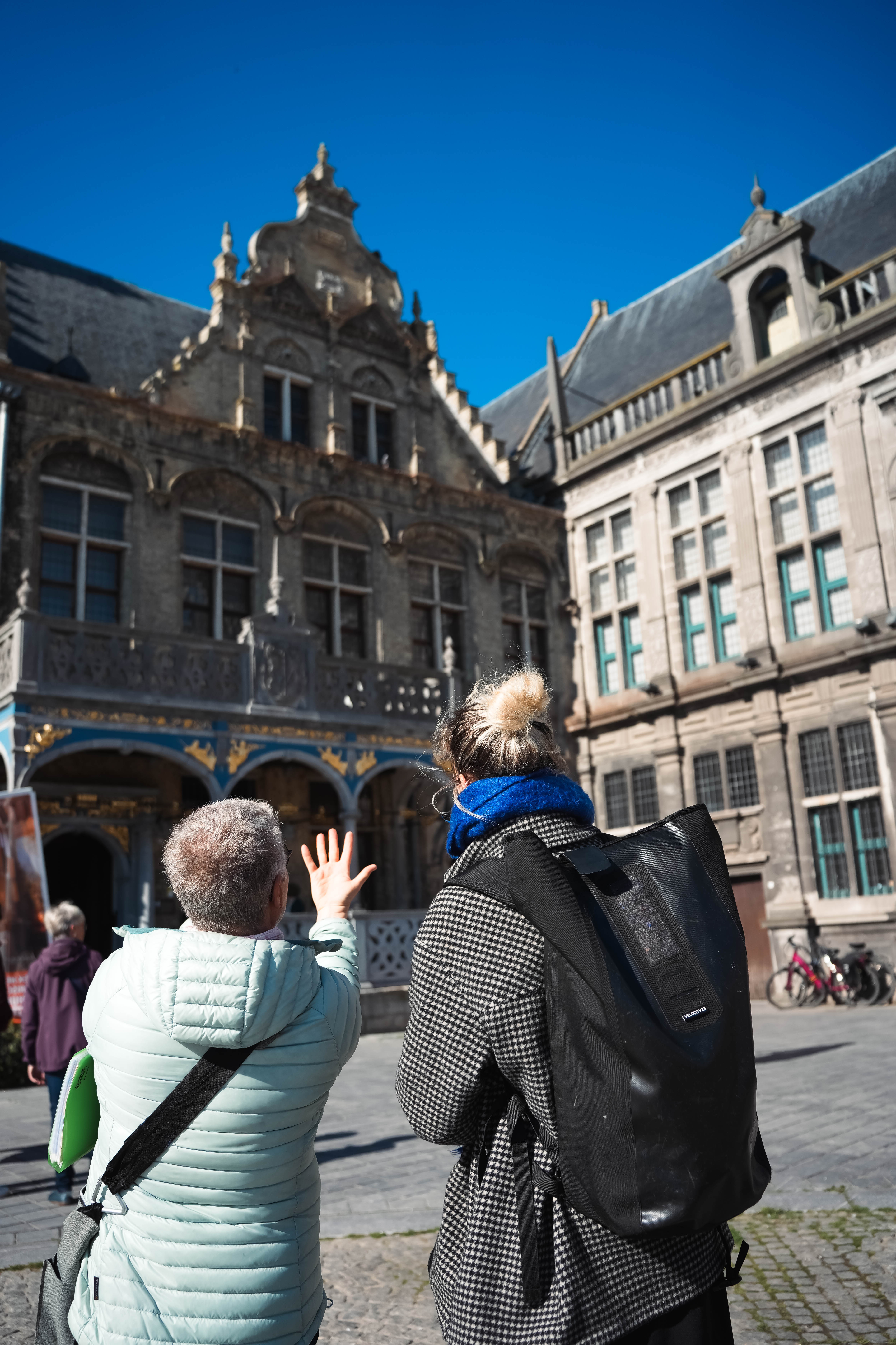 Omdat Veurne niet mag ontbreken in een toer door het oorlogsverleden van de Westhoek, sluiten we ons weekend af met een gegidste stadswandeling. Gewapend met een map vol oude foto’s en schilderijen laat onze gids Greet onderweg het verleden tot leven komen. We startten op de Grote Markt, die in de zeventiende eeuw uit economische noodzaak werd aangelegd onder Albrecht en Isabella – en vandaag nog steeds wordt omzoomd door gebouwen in renaissancestijl. Eén daarvan is het Stad- en Landshuis, dat tijdens WOI dienstdeed als hoofdkwartier van Albert I. Ondanks de nabijheid van het front bleef Veurne grotendeels gespaard van bombardementen, waardoor we langs veel materiële ijkpunten van haar geschiedenis kunnen wandelen. In het Stadspark stuiten we op een restant van een negende-eeuwse mote, waar de eerste bewoners zich vestigden. We passeren onder meer langs de dertiende-eeuwse Sint-Walburgakerk, het Muzekot, het oudste woonhuis van Veurne uit 1570, en achttiende-eeuwse burgerhuizen in de Zwarte Nonnenstraat die gebouwd werden ten tijde van het Oostenrijkse bewind. Onderweg komen we kleine beeldjes van ‘Veurnse slapers’ tegen – een bijnaam die de Veurnaars kregen toen de lakenhandel tussen Engeland en Veurne stil kwam te liggen in 1270.
