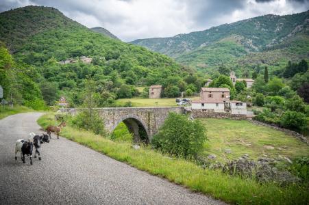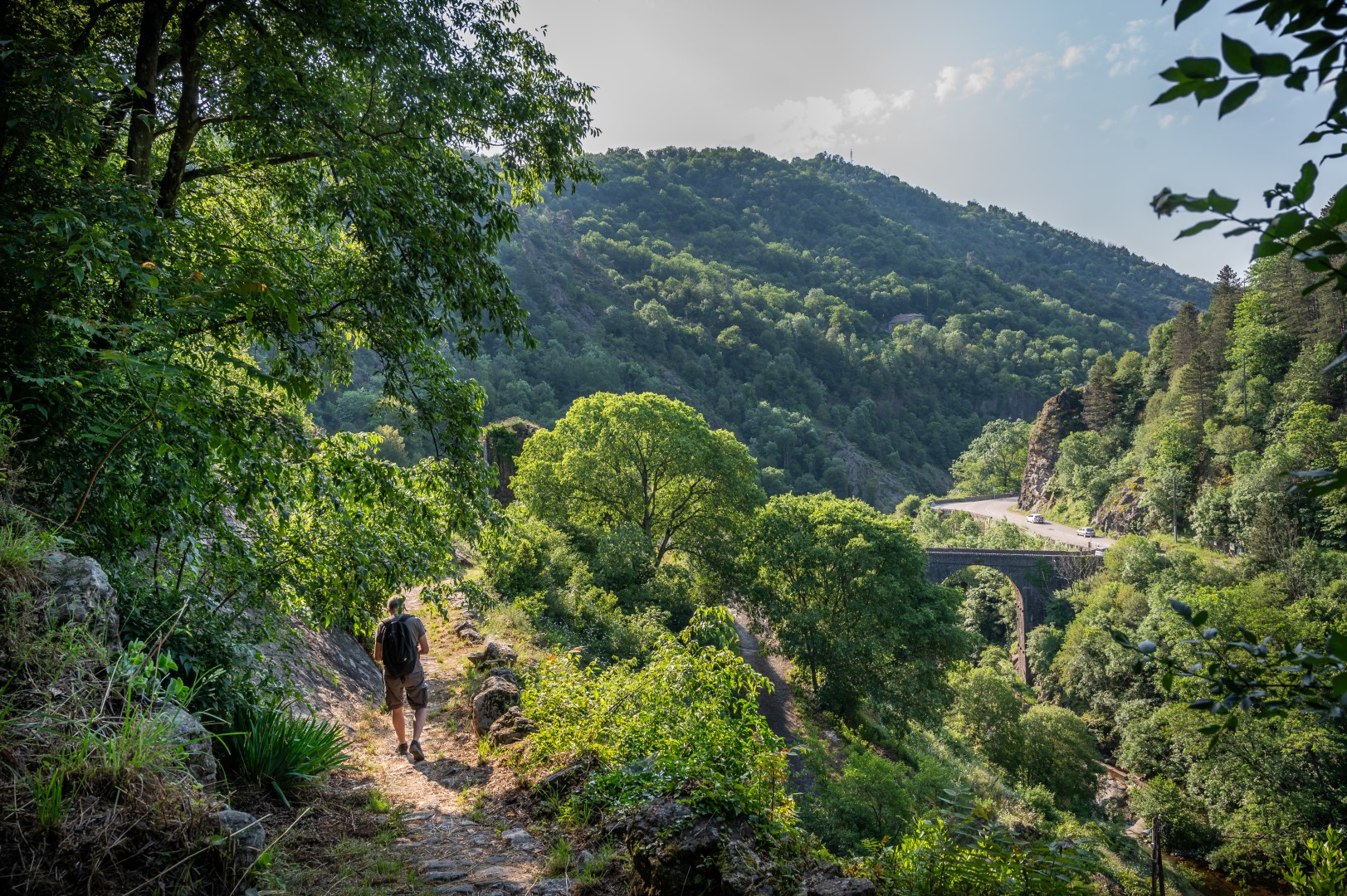 Vals-les-Bains is een kuuroord aan de Volane, waar ook het bronwater Vals gebotteld wordt. Iets ten noorden van Vals is het dorpje Laviolle de startplaats voor onze wandeling naar de boerderij van Rouyon, die haar naam gaf aan deze wandeling. Via opmerkelijke stenen greppels of kanaaltjes en enkele weides trekken we naar de eigenlijke lus vanaf het gehucht Le Villaret (op 660 m). We klimmen langs kastanjeboomgaarden op terrassen. Het is warm, maar we zijn beschut onder de bomen. Toch is het puffen. Het steile pad doet ons 300 m klimmen op amper 2,5 km. Het lijkt wel een trap van stenen.