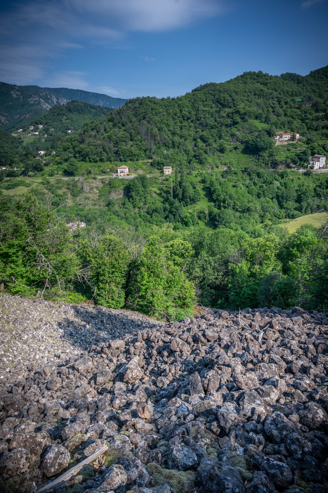 We maken een wandeling rond de lokale vulkaan, de Aizac. We gaan eerst even de andere kant op naar de bekende, eenzame kaasrots: een mooi voorbeeld van poreuze basalt. Het pad is (speciaal voor ons natuurlijk) vers gemaaid. We klimmen over een stenen pad. Dan wacht ons een onwezenlijk zicht: de hele helling van de oostflank ligt bezaaid met kleine en grote basaltblokken. Alsof de vulkaan nog maar net is uitgebarsten. Er staat geen boom, geen sprietje gras groeit ertussen.