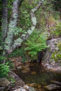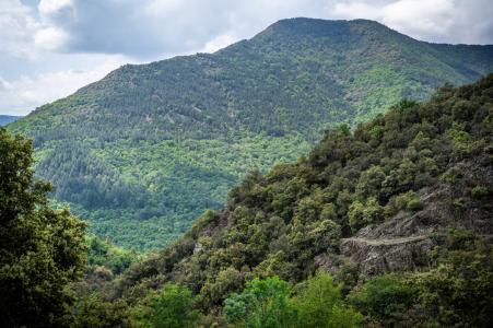 Eind mei, begin juni is het ideaal om hier te wandelen – een onweer niet te na – want in de zomer kan het hier gloeiend heet zijn, met dank aan de rotsbodem, alsof je in een oven rondwandelt. Het pad daalt weer iets, een beukenbos in. We komen bij de ferme de Rouyon, of wat ervan overblijft. Van de overwoekerde boerderijgebouwen staan alleen de buitenmuren nog half recht. Een muur steunt letterlijk op één steen. Wat bezielde mensen op deze moeizaam bereikbare plek te komen boeren? Wat dééd men hier? Hier is geen landbouwgrond. Was dat louter voor de kastanjes? We kunnen het niemand meer vragen. Toch was het geen slechte plek, met voldoende water. Een machtige plek zelfs: hier kon je perfect de watertoevoer tot het dal beheersen.