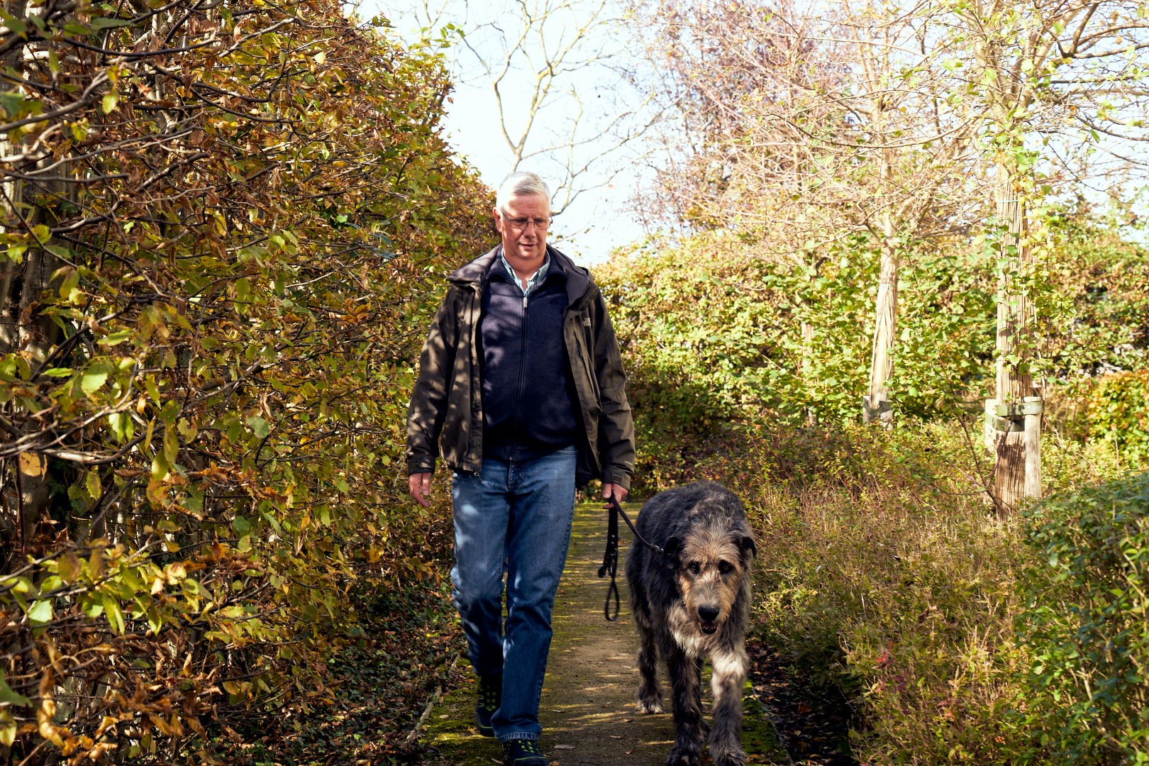 Theo: ‘Ik wandelde altijd al met mijn hond Robbe. Wandelen ontspant me. In de zomer sta ik om zes uur op en loop met Robbe door de stilte. We horen elk vogeltje, genieten van de natuur en de rust… Op een dag kreeg ik telefoon van de gemeente of ik vrijwillig wilde wandelen met de bewoners van assistentiewoningen Felix Brouwershof én met hond Robbe. Meteen, want ik kende enkele bewoners… Er volgden enkele online opleidingen: wat kan de hond betekenen, valpreventie… Dat laatste was erg grappig, want in die drie jaar is er maar één iemand gevallen: ikzelf! Robbe trok me op een gegeven omver op een plek waar ik mijn voeten niet goed kon zetten. Hij is dan ook een Ierse wolfshond van tachtig kilo.
