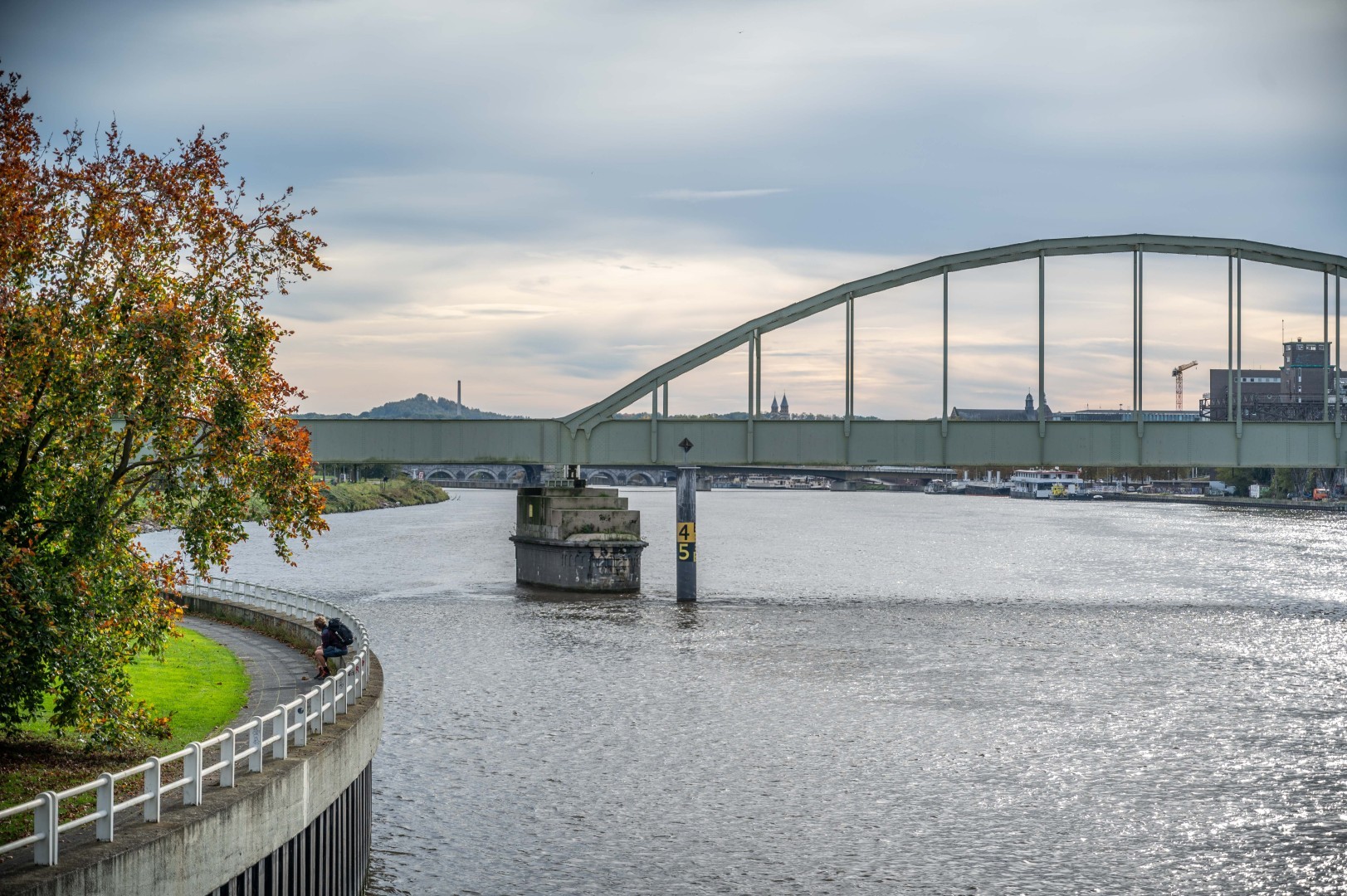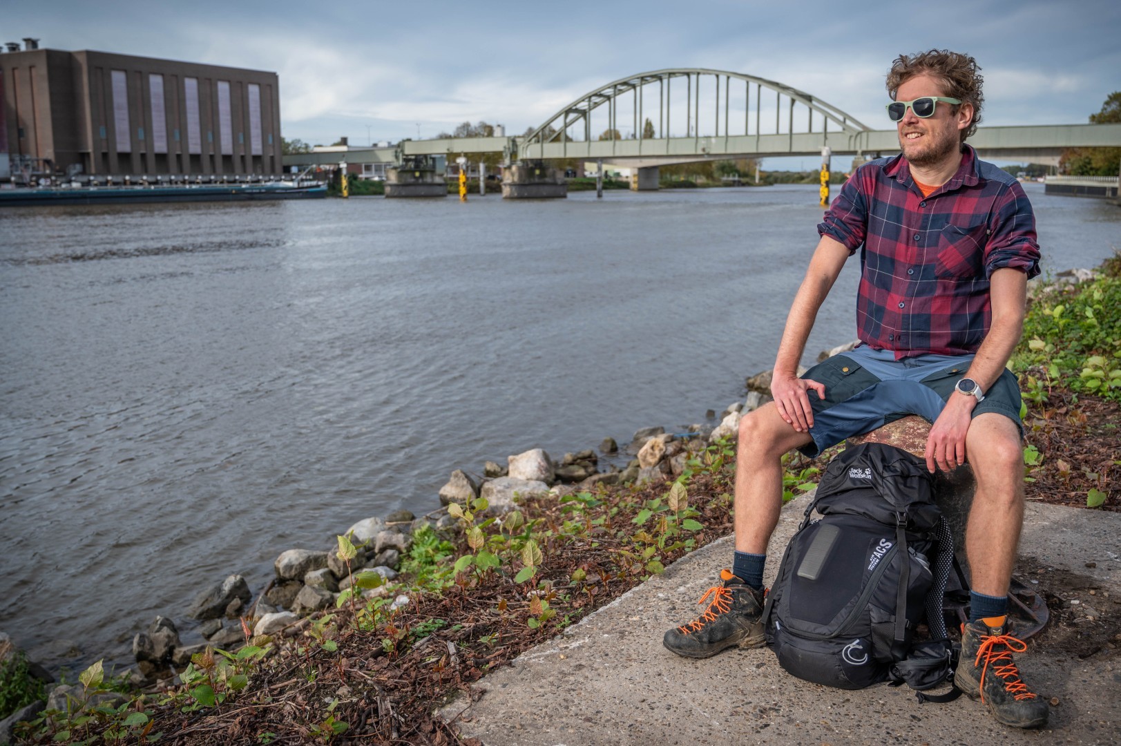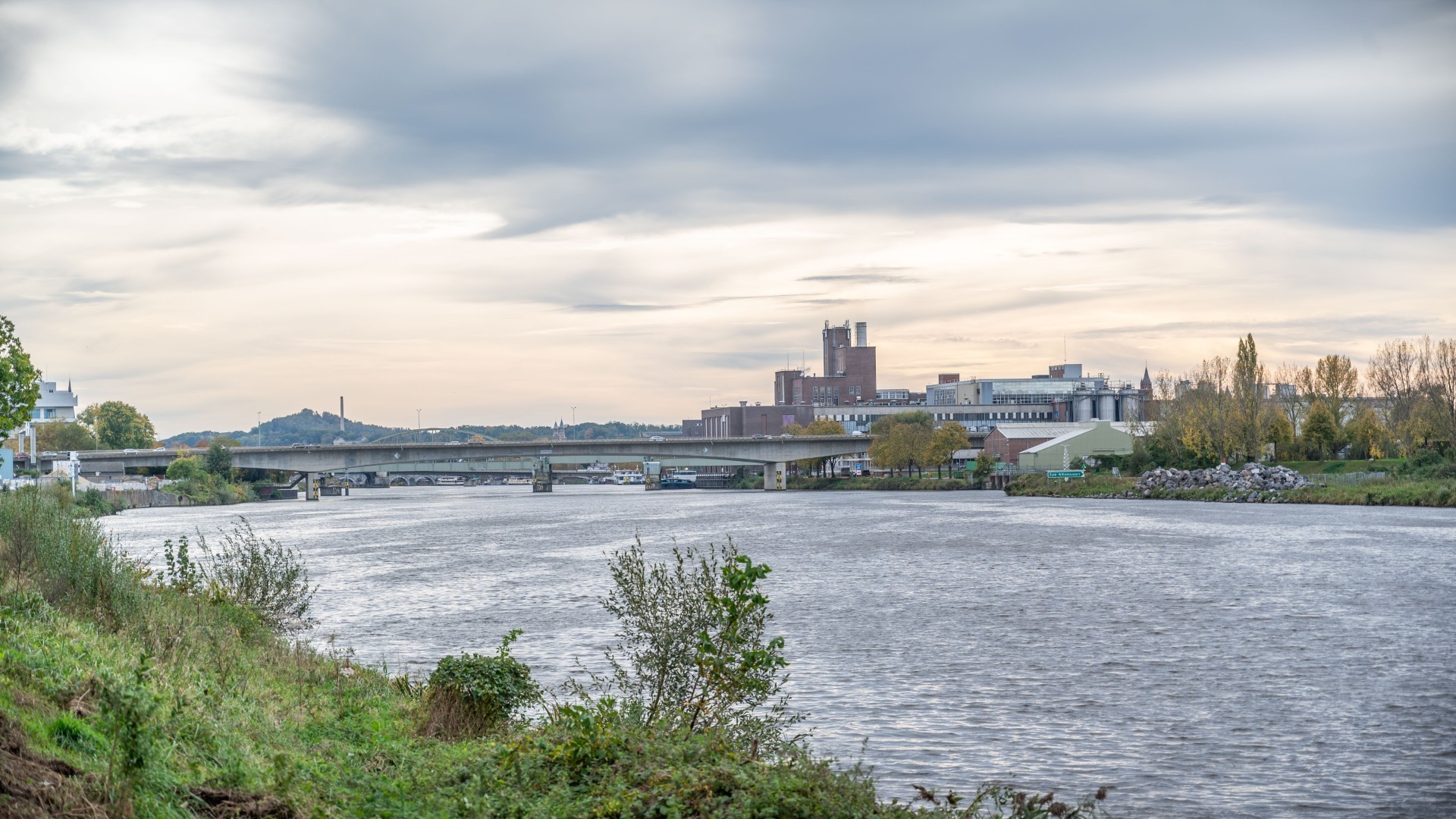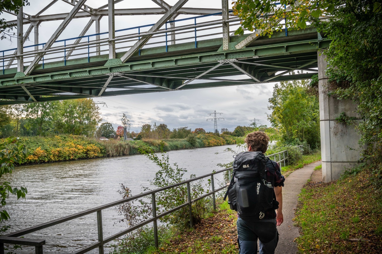 De stad eindigt abrupt. Op het ene moment omringt het vrolijk gekakel van de markt ons, bij het volgende heerst er stilte. Aan een havenbassin droogt een aalscholver zijn vleugels, een voorbode voor hetgeen wij exact negen uur en 28 kilometer verderop zullen doen met onze wandelschoenen. Maar we lopen vooruit op de feiten. Het duurt een tijdje vooraleer we onze tocht op de Maas kunnen kalibreren, die verloren we aan de Sint-Servaasbrug uit het oog. Eerst navigeren we voorbij een kluwen aan kanaaltjes en vaarten, waar woonboten schijnbaar al decennia geen centimeter van plaats bewogen. We wandelen langs een oude spoorbedding, waar bij mooier weer hagedissen zonnen, daarna over de in herfstblaadjes uitgedoste kaaien van de Zuid-Willemsvaart.