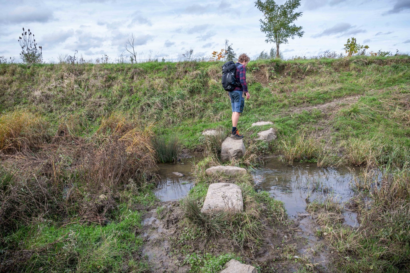 De avond ervoor zijn we laat aangekomen in Elsloo, net op het moment dat de straatlampen aanknipten en de dagjesmensen de middeleeuwse grandeur van het dorp de rug toekeerden. Daardoor komen we traag op gang. Gelukkig zorgt het park van het kasteel - onze slaapplaats - voor een zachte aanloop. Statige bomenrijen gaan eerst over in oude beukenbossen, daarna in een moeras waardoor vlonderpaden kronkelen. We beklimmen een talud vol beversporen en wandelen naast het water van een kanaal. Ter hoogte van het kasteel van Geulle aan de Maas vervoegen we de route weer.