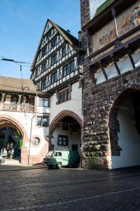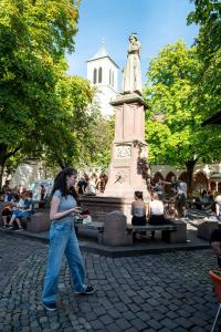 We passeren goedkope eethuizen in de studentenbuurt. De Martinstor is een van de twee bewaarde stadspoorten. De torens werden rond 1900 met een derde verdieping verhoogd, gewoon om de grootste te hebben. We beklimmen de Schlossberg. Het slot is verdwenen, maar niet de oudste druiven van de stad op de steile zuidflank van de heuvel. Aan de andere kant hebben we een mooi zicht op de munsterkerk, opgetrokken in rode zandsteen. Dankzij de open constructie ervan heeft de gotische toren in WO II geen schade geleden van de luchtdrukverplaatsingen tijdens bombardementen op de stad. Dat hadden de middeleeuwers goed voorzien. Bij de munsterkerk is er één waterspuwer met blote billen, heb je ‘m al gespot?