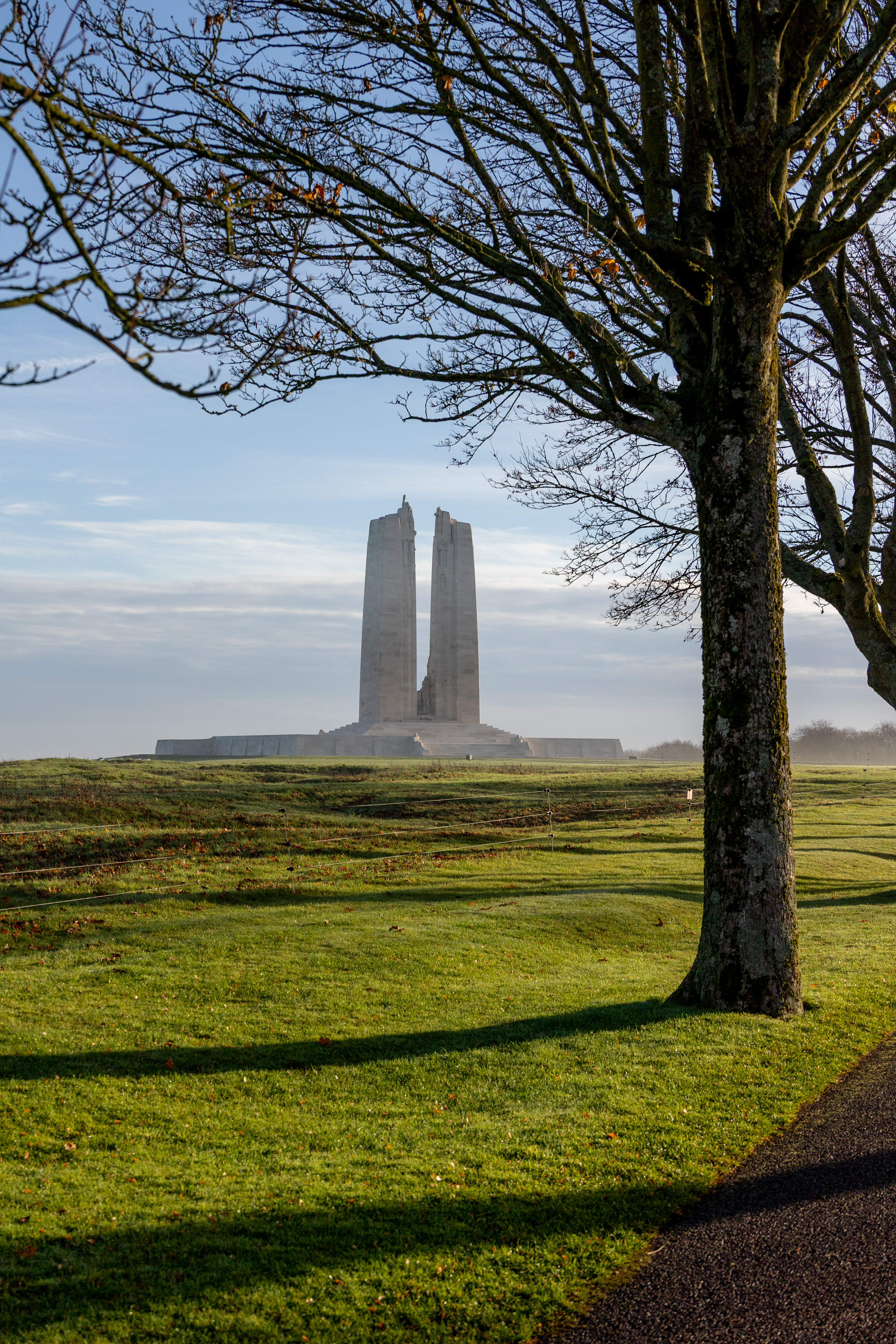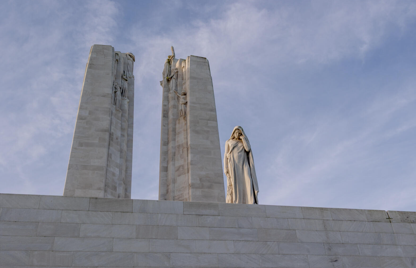 De heuvelrug van Vimy verschijnt in nevel. Het Canadian National Vimy Memorial staat boven op de rug alsof het uit de kalksteen zelf is gegroeid. Twee hoge zuilen rijzen op uit een brede sokkel, elk hoger dan je verwacht wanneer je ernaartoe wandelt. Ze vertegenwoordigen Frankrijk en Canada, verbonden in stilte. Aan de voet staan gebeeldhouwde figuren die geen heldendom verkondigen. De bekendste, Canada Bereft, kijkt gebogen uit over het terrein, een vrouw die rouwt om zonen die nooit terugkeerden. Het toont wat oorlog kost. Op de muren rond de sokkel staan meer dan 11.000 namen van Canadese soldaten zonder gekend graf. De namen golven verder, een generatie die alleen door steen kon worden tegengehouden van opnieuw uit het geheugen te worden gewist. Rond het monument liggen loopgraven en kraters die als littekens in het gras liggen. De honderd jaar ertussen hebben niets gladgestreken.