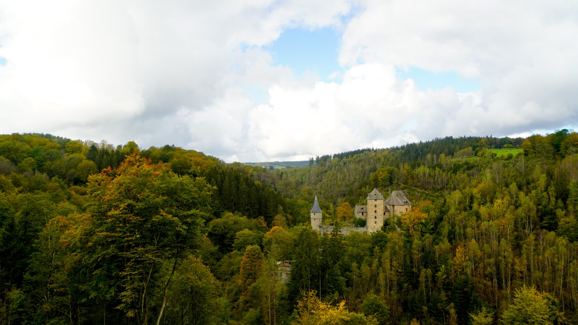 De eerste kilometers voeren me door het Preusbos, waar de herfst zich al laat voelen. Varens kleuren warm oranje, vlinders fladderen door het zonlicht, mezen huppen van tak naar tak, en het licht dwarrelt zachtjes met de bladeren mee naar beneden. Ik voel me een gast in een perfect georkestreerd ecosysteem en laat de stilte op me inwerken. Het pad is uitstekend bewegwijzerd: een voorbode voor zorgeloos ronddwalen, terwijl de Hohnbach-rivier als een metgezel zachtjes naast me meandert.